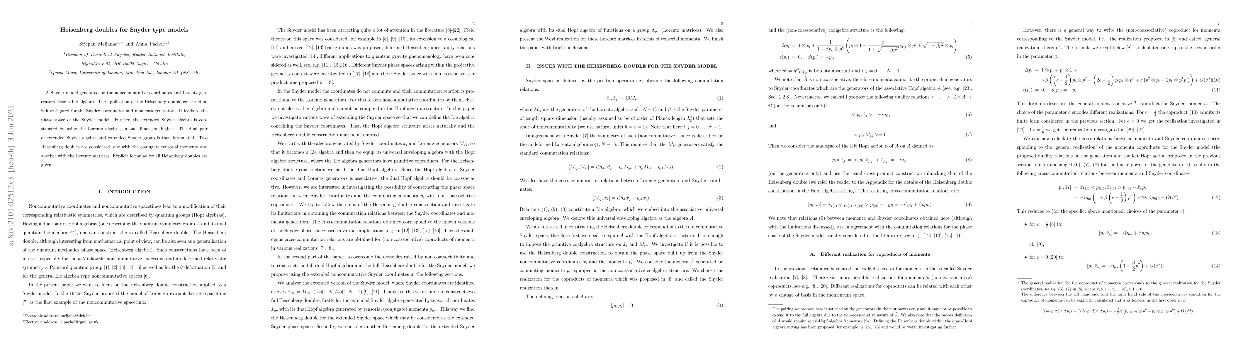 A Snyder model generated by the noncommutative coordinates and Lorentz generators close a Lie algebra. The application of the Heisenberg double construction is investigated for the Snyder coordinates and momenta generators. It leads to the phase space of the Snyder model. Further, the extended Snyder algebra is constructed by using the Lorentz algebra, in one dimension higher. The dual pair of extended Snyder algebra and extended Snyder group is then formulated. Two Heisenberg doubles are considered, one with the conjugate tensorial momenta and another with the Lorentz matrices. Explicit formulae for all Heisenberg doubles are given.