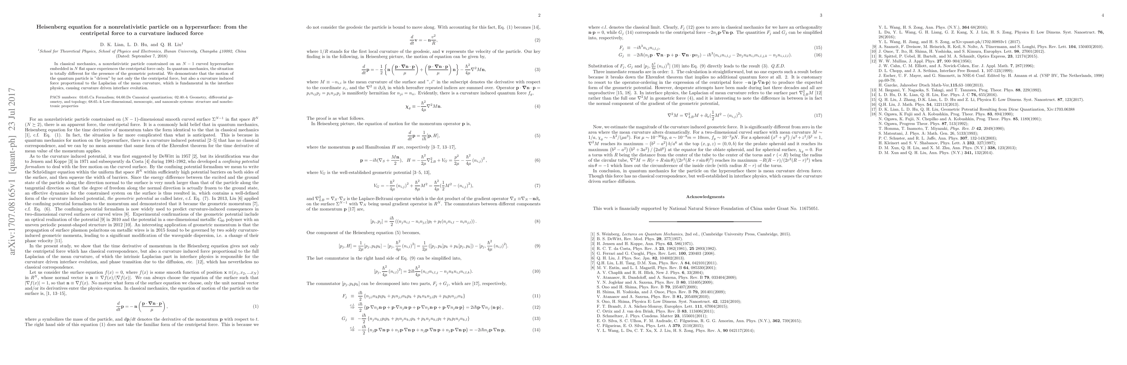 In classical mechanics, a nonrelativistic particle constrained on an $N-1$ curved hypersurface embedded in $N$ flat space experiences the centripetal force only. In quantum mechanics, the situation is totally different for the presence of the geometric potential. We demonstrate that the motion of the quantum particle is "driven" by not only the the centripetal force, but also a curvature induced force proportional to the Laplacian of the mean curvature, which is fundamental in the interface physics, causing curvature driven interface evolution.