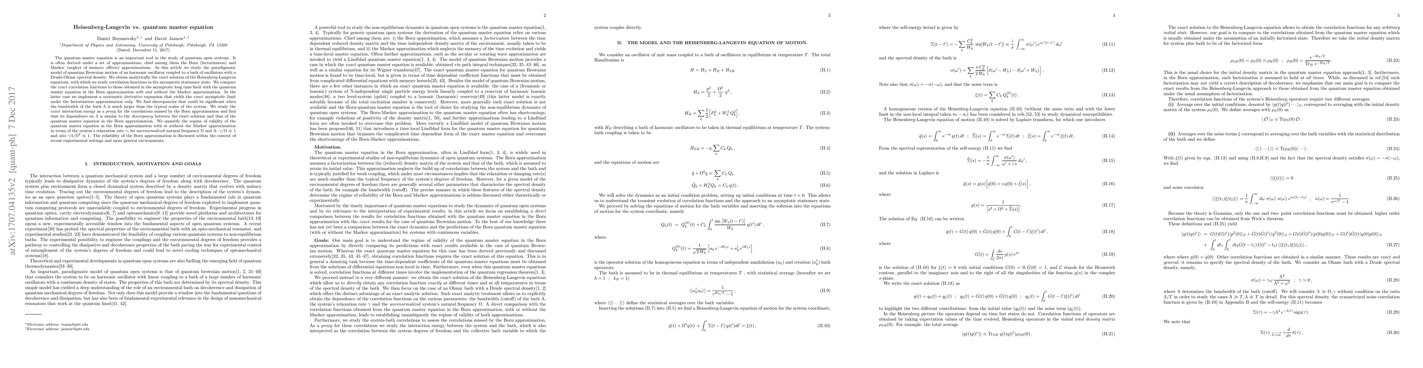 The quantum master equation is an important tool in the study of quantum open systems. It is often derived under a set of approximations, chief among them the Born (factorization) and Markov (neglect of memory effects) approximations. In this article we study the paradigmatic model of quantum Brownian motion of an harmonic oscillator coupled to a bath of oscillators with a Drude-Ohmic spectral density. We obtain analytically the \emph{exact} solution of the Heisenberg-Langevin equations, with which we study correlation functions in the asymptotic stationary state. We compare the \emph{exact} correlation functions to those obtained in the asymptotic long time limit with the quantum master equation in the Born approximation \emph{with and without} the Markov approximation. In the latter case we implement a systematic derivative expansion that yields the \emph{exact} asymptotic limit under the factorization approximation \emph{only}. We find discrepancies that could be significant when the bandwidth of the bath $\Lambda$ is much larger than the typical scales of the system. We study the \emph{exact} interaction energy as a \emph{proxy} for the correlations missed by the Born approximation and find that its dependence on $\Lambda$ is similar to the \emph{discrepancy} between the exact solution and that of the quantum master equation in the Born approximation. We quantify the regime of validity of the quantum master equation in the Born approximation with or without the Markov approximation in terms of the system's relaxation rate $\gamma$, its \emph{unrenormalized} natural frequency $\Omega$ and $\Lambda$: $\gamma/\Omega \ll 1$ and \emph{also} $\gamma \Lambda/\Omega^2 \ll 1$. The reliability of the Born approximation is discussed within the context of recent experimental settings and more general environments.