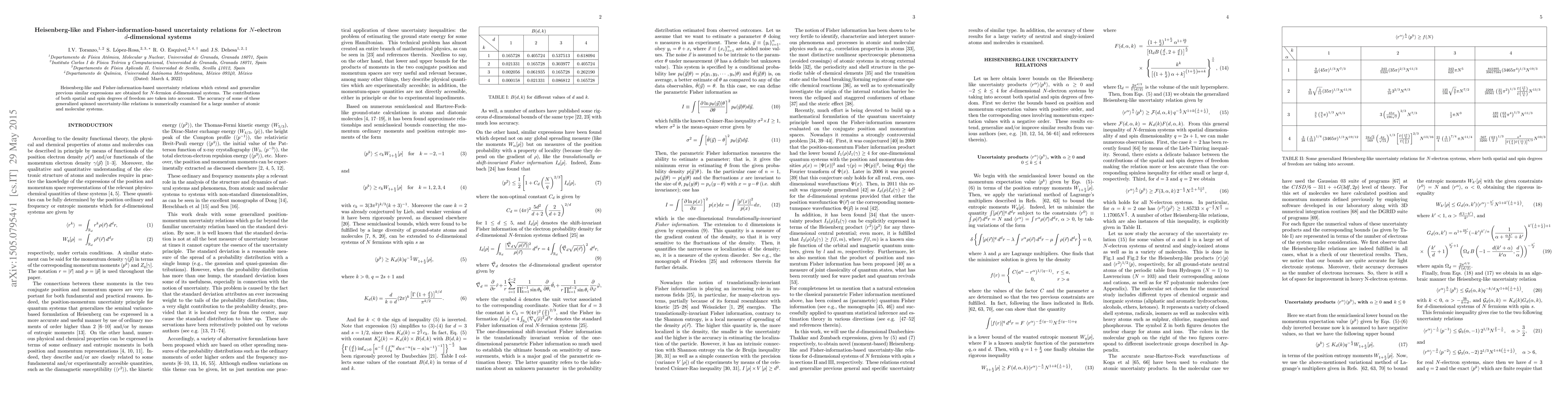 This paper derives Heisenberg-like and Fisher-information-based uncertainty relations for $N$-fermion $d$-dimensional systems, incorporating both spatial and spin degrees of freedom, and numerically verifies the accuracy of these generalized relations across various atomic and molecular systems.