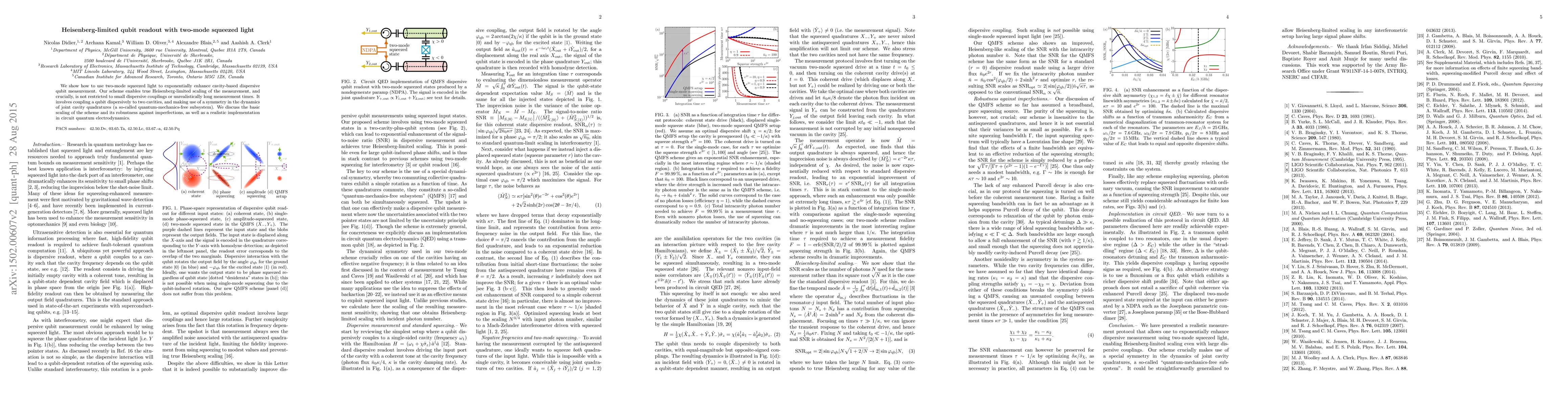 This paper proposes a method to achieve Heisenberg-limited qubit readout using two-mode squeezed light, enhancing cavity-based dispersive qubit measurement without relying on small couplings or long measurement times. The scheme leverages a quantum-mechanics-free subsystem for improved scaling and robustness against imperfections, applicable in circuit quantum electrodynamics.