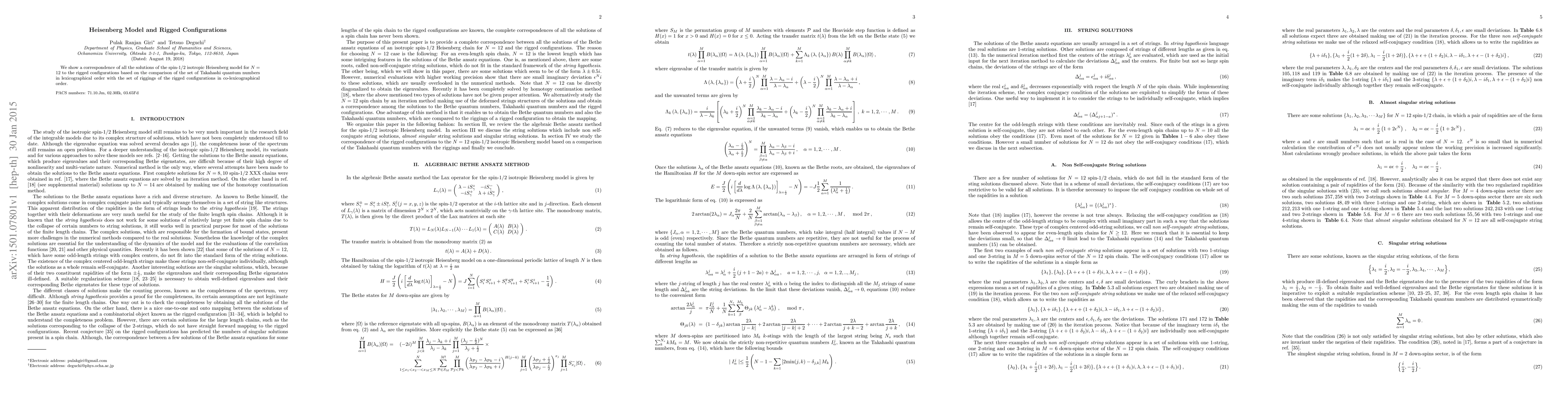 This paper establishes a correspondence between the solutions of the spin-1/2 Heisenberg model for N=12 and rigged configurations, by aligning Takahashi quantum numbers with riggings in specific ordered sequences.