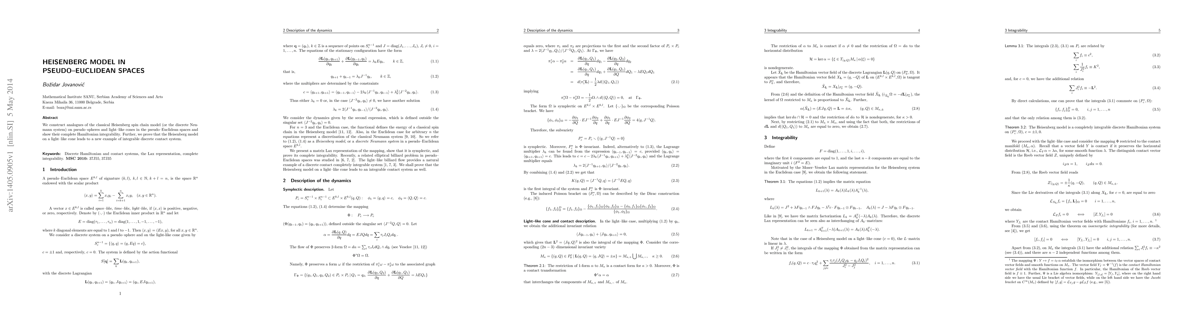 This paper constructs integrable analogues of the Heisenberg spin chain model on pseudo-spheres and light-like cones in pseudo-Euclidean spaces, demonstrating their Hamiltonian integrability and introducing a new integrable discrete contact system from the model on a light-like cone.