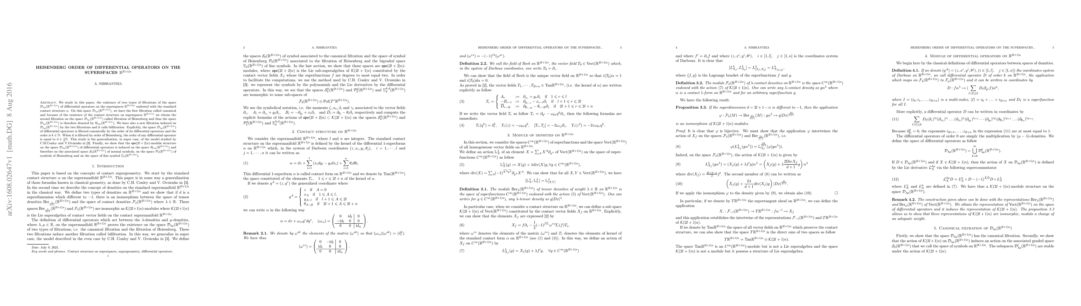 This paper investigates the existence of three filtrations on differential operators on superspaces, including a canonical filtration, a Heisenberg filtration, and a bifiltration, with implications for symplectic supermodules.