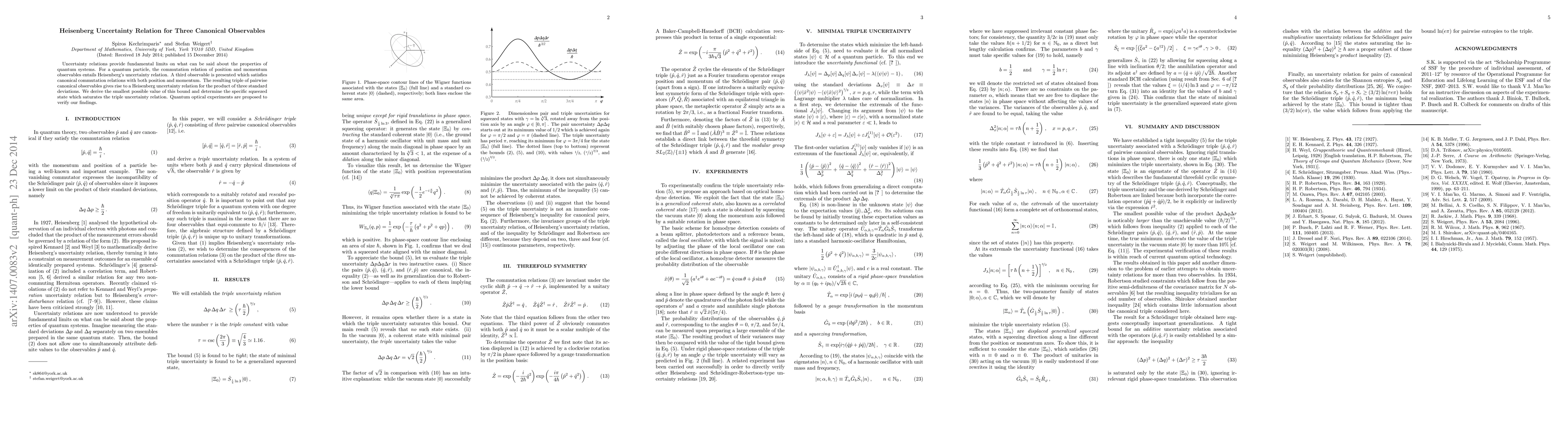 This paper derives a Heisenberg uncertainty relation for three canonical observables, determining the smallest possible bound for the product of their standard deviations and identifying a squeezed state that saturates this relation. Proposed quantum optical experiments aim to verify these theoretical findings.