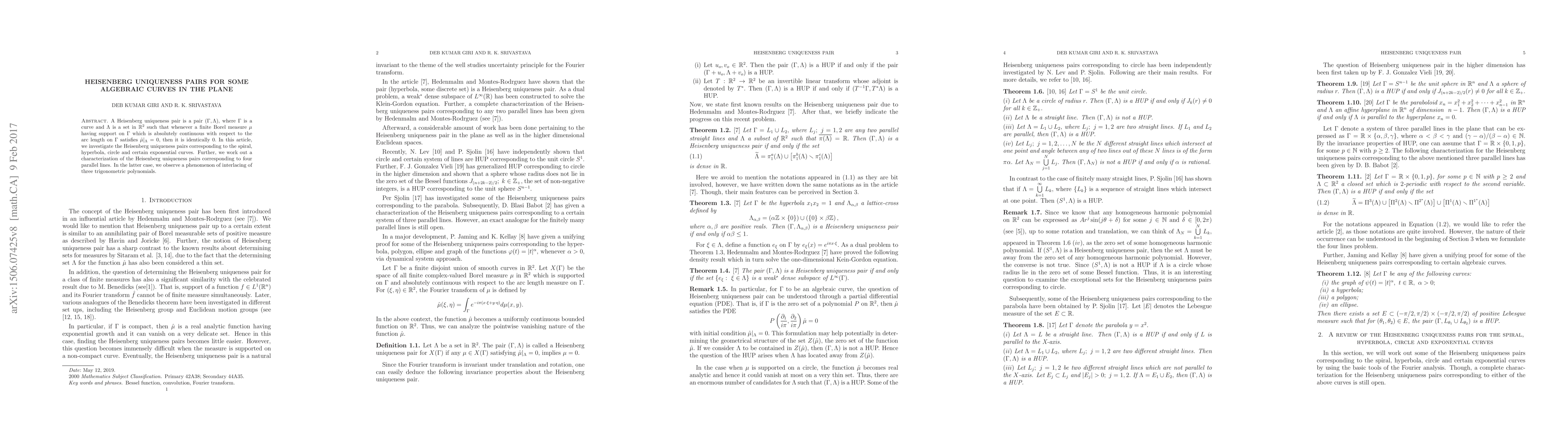 This paper explores Heisenberg uniqueness pairs associated with various algebraic curves, including spirals, hyperbolas, circles, and exponential curves. It also characterizes the pairs for four parallel lines, noting an interlacing phenomenon among three trigonometric polynomials.