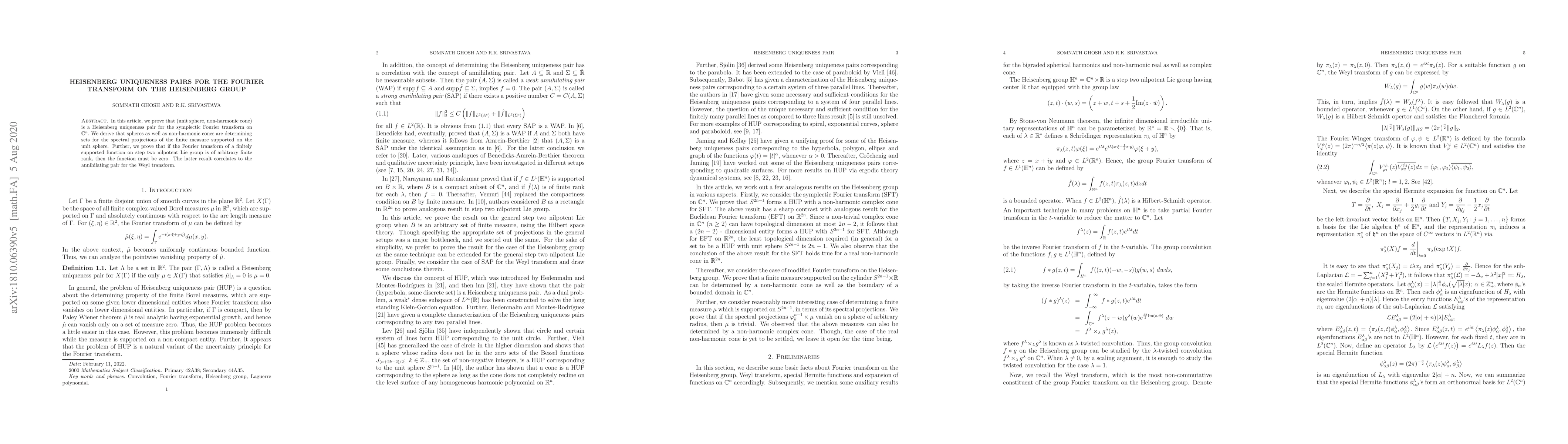 This paper establishes that the pair (unit sphere, non-harmonic cone) forms a Heisenberg uniqueness pair for the symplectic Fourier transform on $\mathbb{C}^n$. It also demonstrates that spheres and non-harmonic cones determine spectral projections for finite measures on the unit sphere, and proves that a finitely supported function's Fourier transform of finite rank on a step two nilpotent Lie group must be zero.