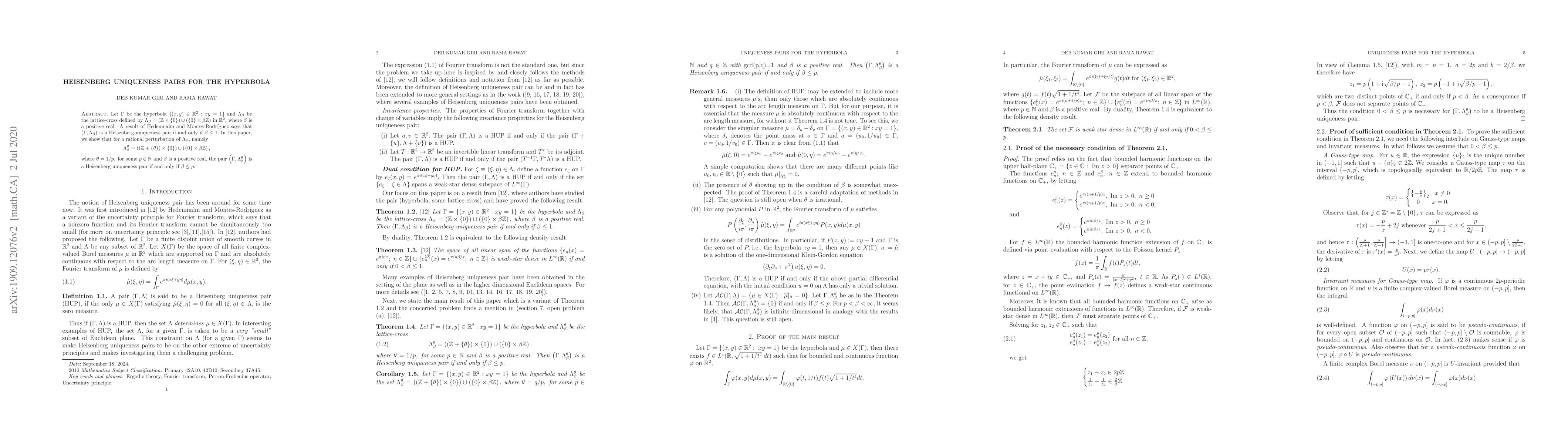 Researchers find that a rational perturbation of a lattice can create a Heisenberg uniqueness pair with a hyperbola under certain conditions, specifically when the perturbation factor is less than or equal to p, where p is a natural number.