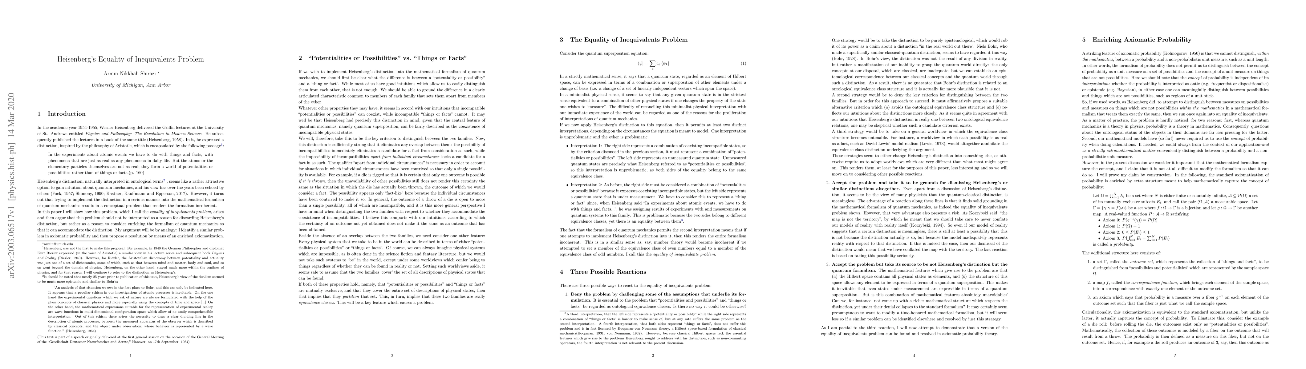 Heisenberg's "equality of inequivalents problem" reveals that introducing classical distinctions into quantum formalism leads to incoherence. The paper proposes an enriched axiomatization of probability to address similar issues, suggesting a third reaction to the problem: attributing it to the quantum formalism rather than Heisenberg's distinctions.