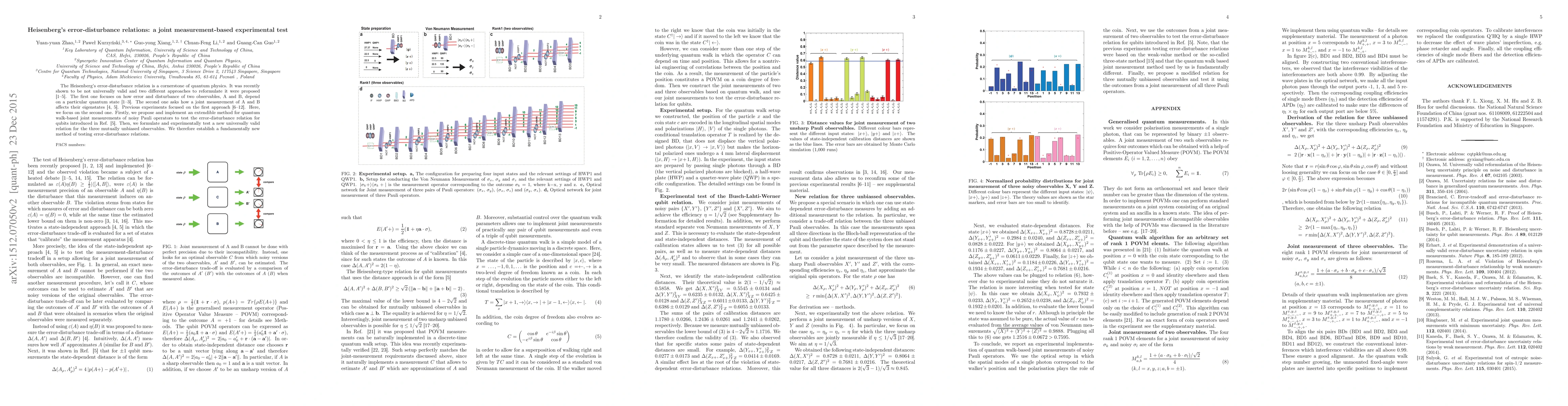 This paper proposes and implements a novel quantum walk-based method for joint measurements of noisy Pauli operators to test Heisenberg's error-disturbance relation for qubits, establishing a new universally valid relation for three mutually unbiased observables and introducing a fundamentally different approach to verifying these relations.