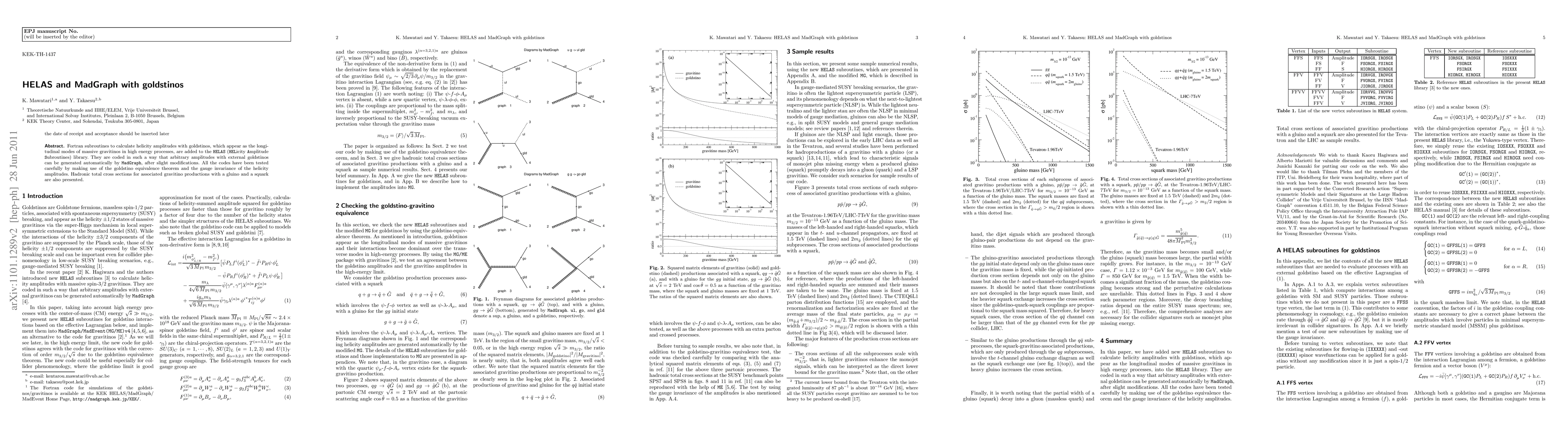 Fortran subroutines to calculate helicity amplitudes with goldstinos, which appear as the longitudinal modes of massive gravitinos in high energy processes, are added to the HELAS (HELicity Amplitude Subroutines) library. They are coded in such a way that arbitrary amplitudes with external goldstinos can be generated automatically by MadGraph, after slight modifications. All the codes have been tested carefully by making use of the goldstino equivalence theorem and the gauge invariance of the helicity amplitudes. Hadronic total cross sections for associated gravitino productions with a gluino and a squark are also presented.