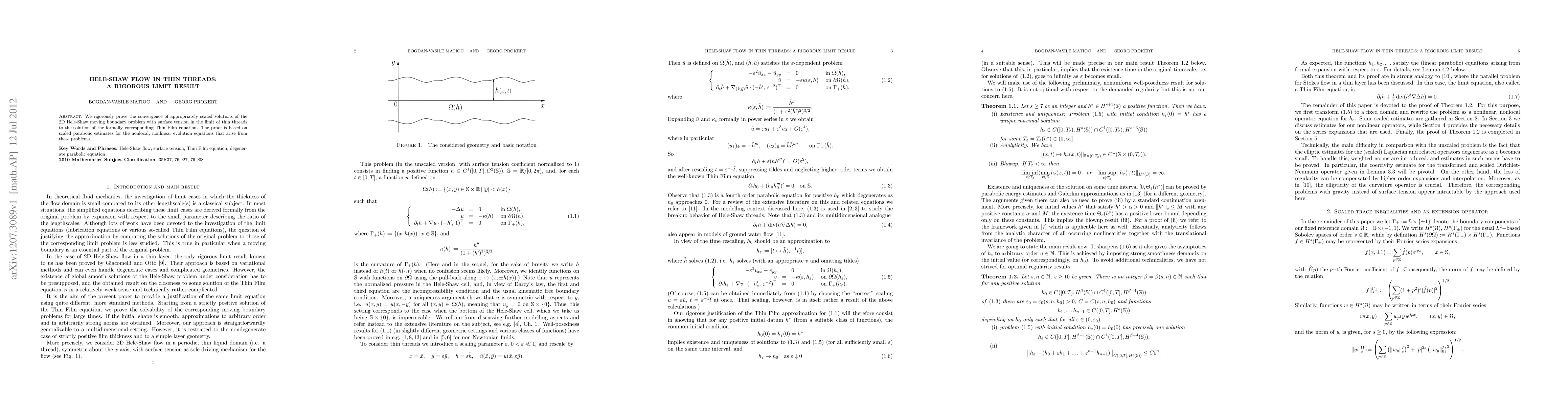 This paper rigorously proves the convergence of scaled solutions of the 2D Hele-Shaw problem with surface tension to the Thin Film equation as the thread thickness approaches zero, using scaled parabolic estimates for the underlying nonlocal, nonlinear evolution equations.