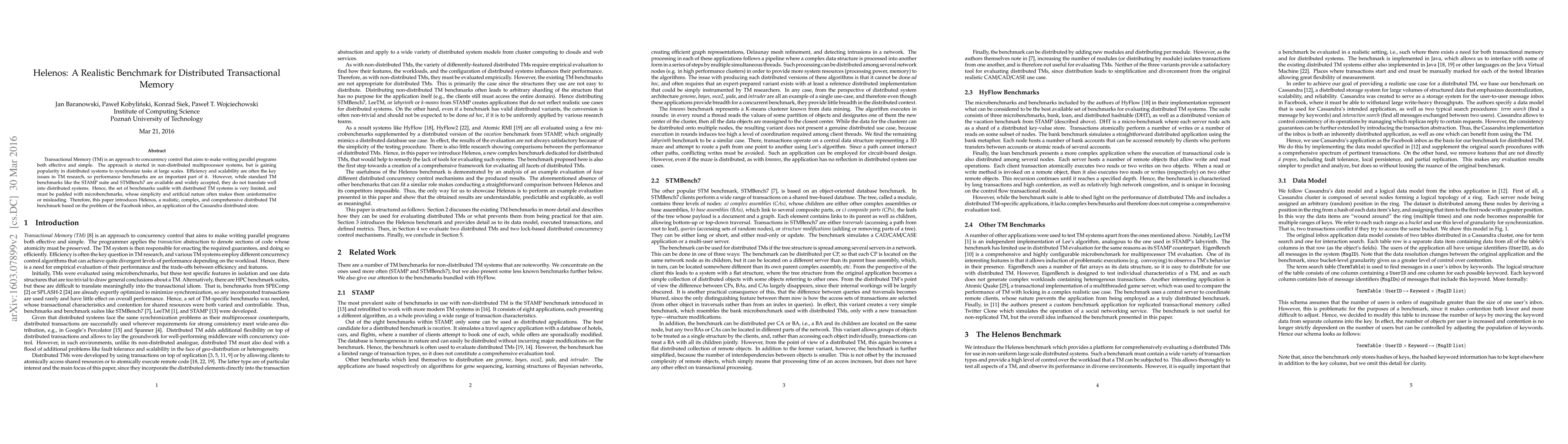 Transactional Memory (TM) is an approach to concurrency control that aims to make writing parallel programs both effective and simple. The approach is started in non-distributed multiprocessor systems, but is gaining popularity in distributed systems to synchronize tasks at large scales. Efficiency and scalability are often the key issues in TM research, so performance benchmarks are an important part of it. However, while standard TM benchmarks like the STAMP suite and STMBench7 are available and widely accepted, they do not translate well into distributed systems. Hence, the set of benchmarks usable with distributed TM systems is very limited, and must be padded with microbenchmarks, whose simplicity and artificial nature often makes them uninformative or misleading. Therefore, this paper introduces Helenos, a realistic, complex, and comprehensive distributed TM benchmark based on the problem of the Facebook inbox, an application of the Cassandra distributed store.