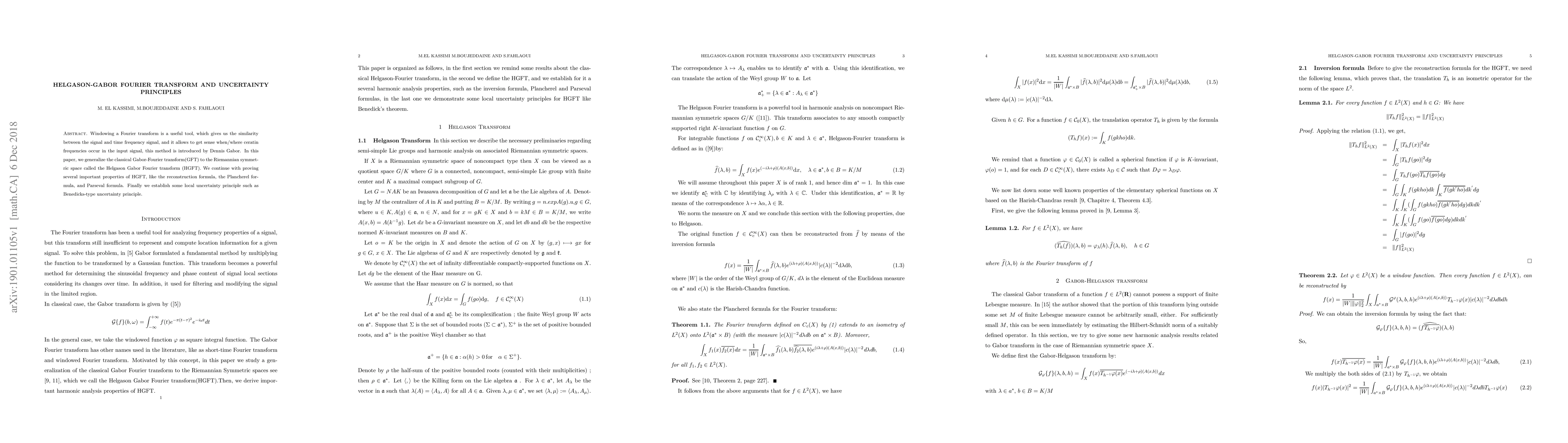 This paper generalizes the classical Gabor-Fourier transform to the Helgason Gabor Fourier transform on Riemannian symmetric spaces, proving its reconstruction, Plancherel, and Parseval formulas. It also establishes a local uncertainty principle, enhancing our understanding of frequency localization in signals.
