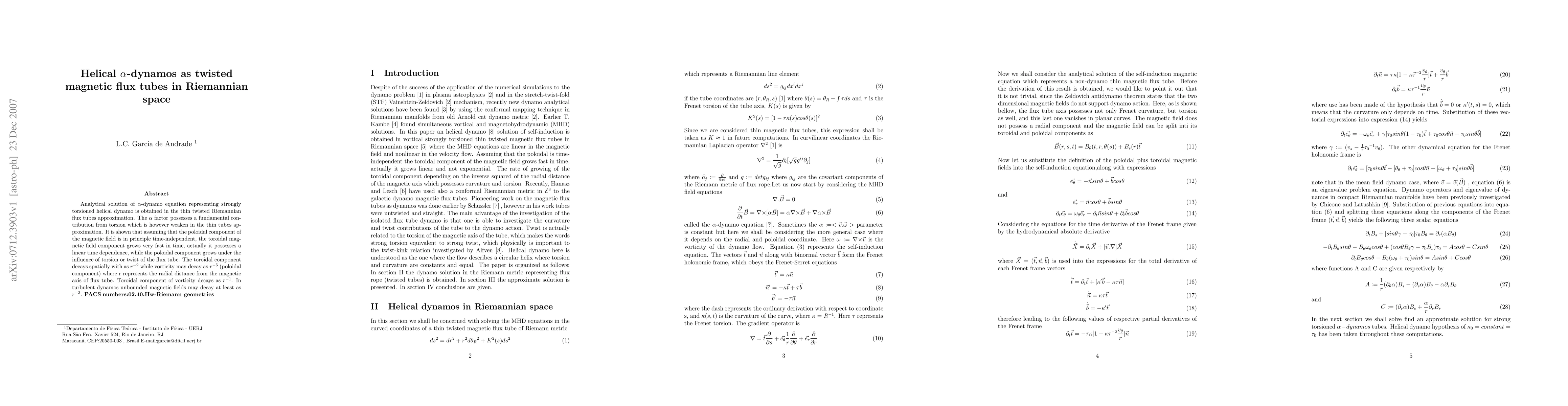 Analytical solution of ${\alpha}$-dynamo equation representing strongly torsioned helical dynamo is obtained in the thin twisted Riemannian flux tubes approximation. The $\alpha$ factor possesses a fundamental contribution from torsion which is however weaken in the thin tubes approximation. It is shown that assuming that the poloidal component of the magnetic field is in principle time-independent, the toroidal magnetic field component grows very fast in time, actually it possesses a linear time dependence, while the poloidal component grows under the influence of torsion or twist of the flux tube. The toroidal component decays spatially with as $r^{-2}$ while vorticity may decay as $r^{-5}$ (poloidal component) where r represents the radial distance from the magnetic axis of flux tube. Toroidal component of vorticity decays as $r^{-1}$. In turbulent dynamos unbounded magnetic fields may decay at least as $r^{-3}$.