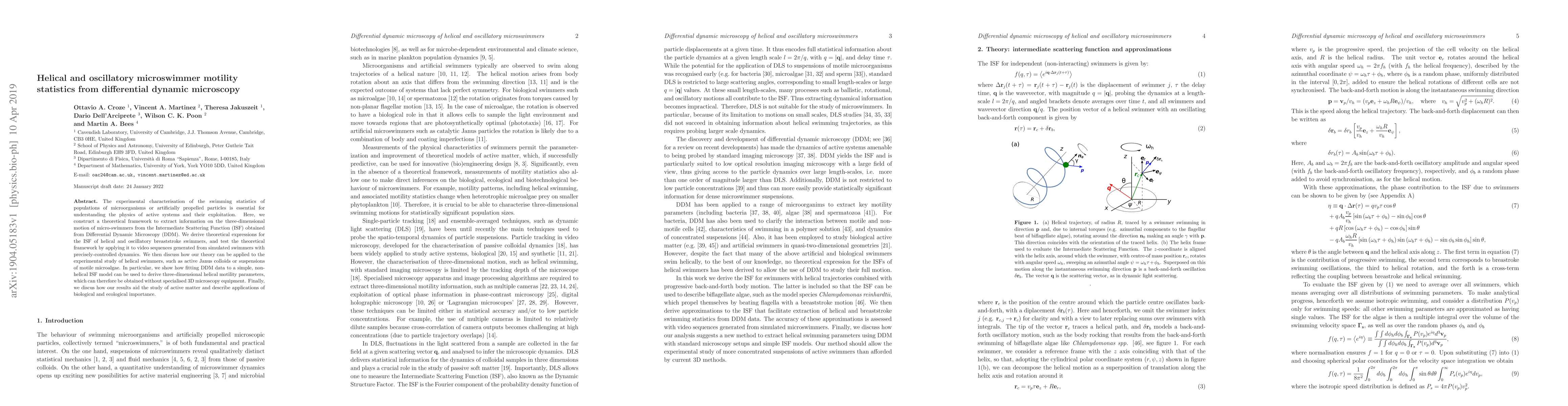 The experimental characterisation of the swimming statistics of populations of microorganisms or artificially propelled particles is essential for understanding the physics of active systems and their exploitation. Here, we construct a theoretical framework to extract information on the three-dimensional motion of micro-swimmers from the Intermediate Scattering Function (ISF) obtained from Differential Dynamic Microscopy (DDM). We derive theoretical expressions for the ISF of helical and oscillatory breaststroke swimmers, and test the theoretical framework by applying it to video sequences generated from simulated swimmers with precisely-controlled dynamics. We then discuss how our theory can be applied to the experimental study of helical swimmers, such as active Janus colloids or suspensions of motile microalgae. In particular, we show how fitting DDM data to a simple, non-helical ISF model can be used to derive three-dimensional helical motility parameters, which can therefore be obtained without specialised 3D microscopy equipment. Finally, we discus how our results aid the study of active matter and describe applications of biological and ecological importance.