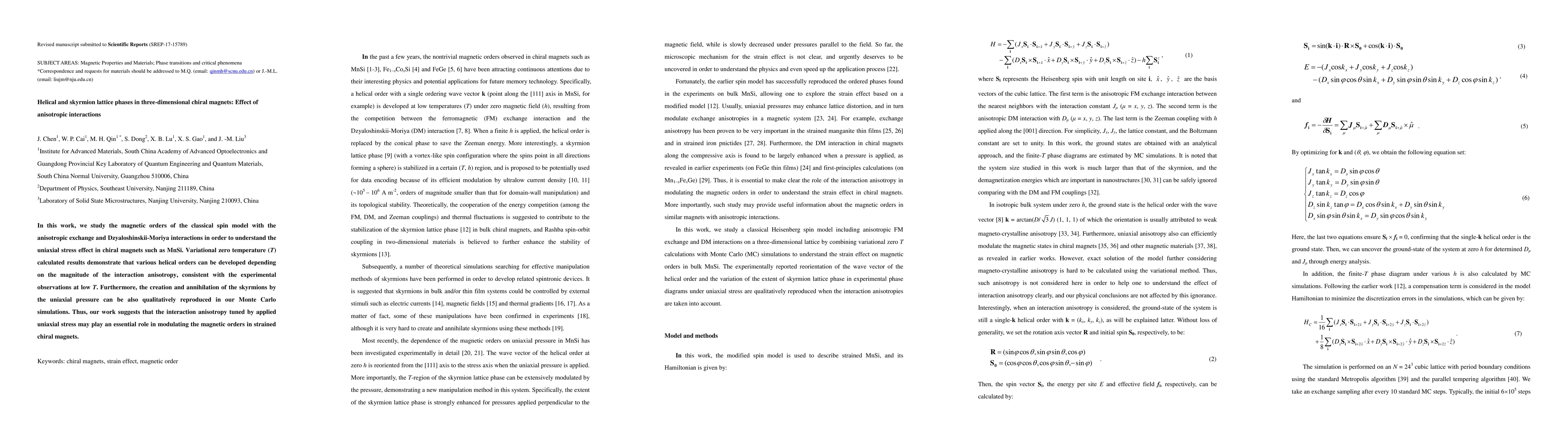 This paper investigates the magnetic orders in chiral magnets like MnSi under anisotropic interactions and Dzyaloshinskii-Moriya interactions, revealing various helical phases and skyrmion behaviors influenced by uniaxial stress. The results from variational calculations and Monte Carlo simulations suggest that interaction anisotropy, modulated by stress, significantly affects the magnetic order in chiral magnets.