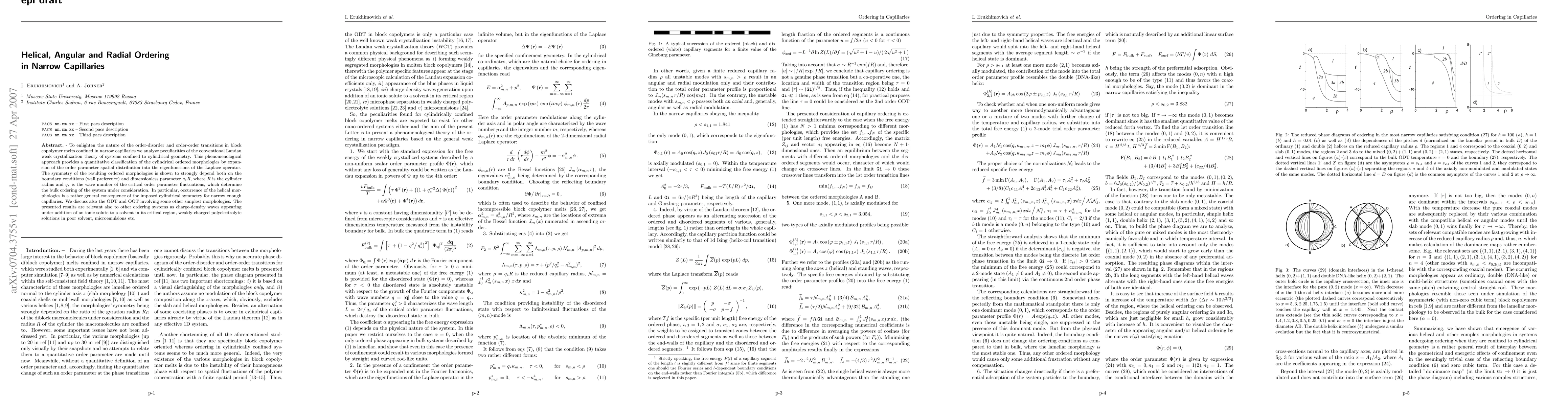 This paper investigates the order-disorder transitions in block copolymer melts confined in narrow cylindrical capillaries, applying Landau theory to classify the resulting ordered morphologies. It reveals that helical, angular, and radial ordering patterns emerge depending on the cylinder radius and critical order parameter fluctuations, with implications for various ordering systems like charge-density waves and polyelectrolyte solutions.