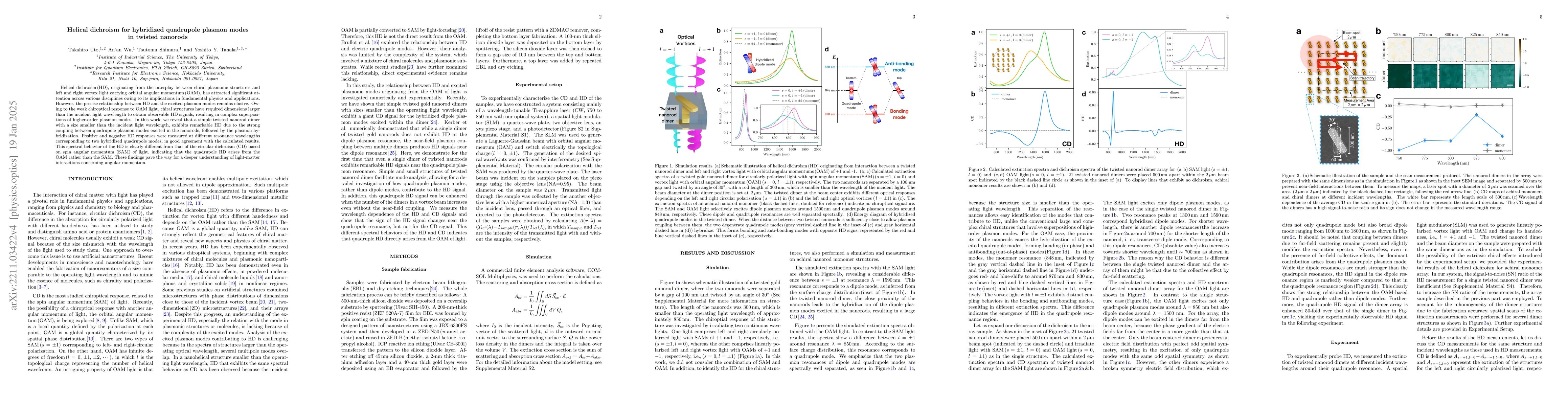 This study experimentally demonstrates that helical dichroism (HD) in twisted gold nanorod dimers arises due to the hybridization of quadrupole plasmon modes rather than dipole modes. The HD signal's dependence on the incident light wavelength reveals a sign change around the quadrupole plasmon resonance, providing deeper insights into light-matter interactions involving angular momentum.