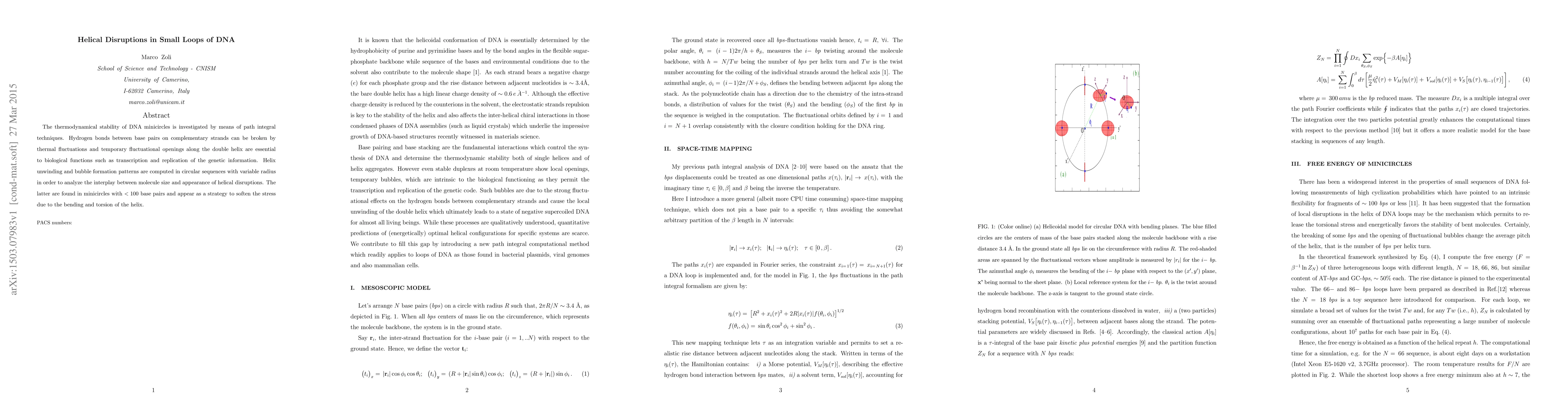 This paper investigates the thermodynamic stability of small DNA minicircles using path integral techniques, revealing that helical disruptions and bubble formations in loops with fewer than 100 base pairs serve to alleviate stress from bending and torsion, facilitating essential biological functions like transcription and replication.