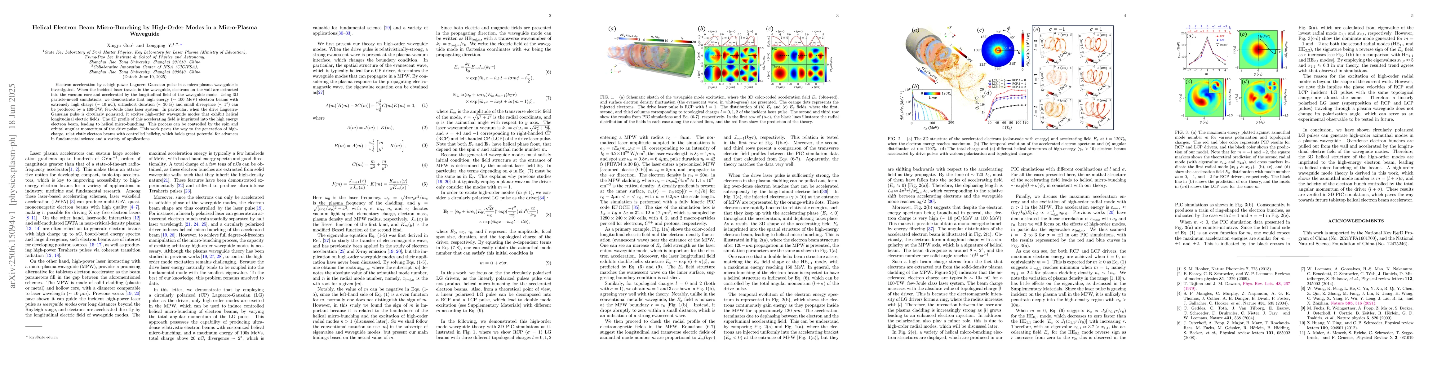 Electron acceleration by a high-power Laguerre-Gaussian pulse in a micro-plasma waveguide is investigated. When the incident laser travels in the waveguide, electrons on the wall are extracted into the vacuum core and accelerated by the longitudinal field of the waveguide mode. Using 3D particle-in-cell simulations, we demonstrate that high energy (~100 MeV) electron beams with extremely high charge (~10 nC), ultrashort duration (~30 fs) and small divergence (~1 deg) can be produced by a 100-TW, few-Joule class laser system. In particular, when the drive Laguerre-Gaussian pulse is circularly polarized, it excites high-order waveguide modes that exhibit helical longitudinal electric fields. The 3D profile of this accelerating field is imprinted into the high energy electron beam, leading to helical micro-bunching. This process can be controlled by the spin and orbital angular momentum of the drive pulse. This work paves the way to the generation of highcharge, relativistic electron beams with controlled helicity, which holds great potential for advances in fundamental science and a variety of applications.