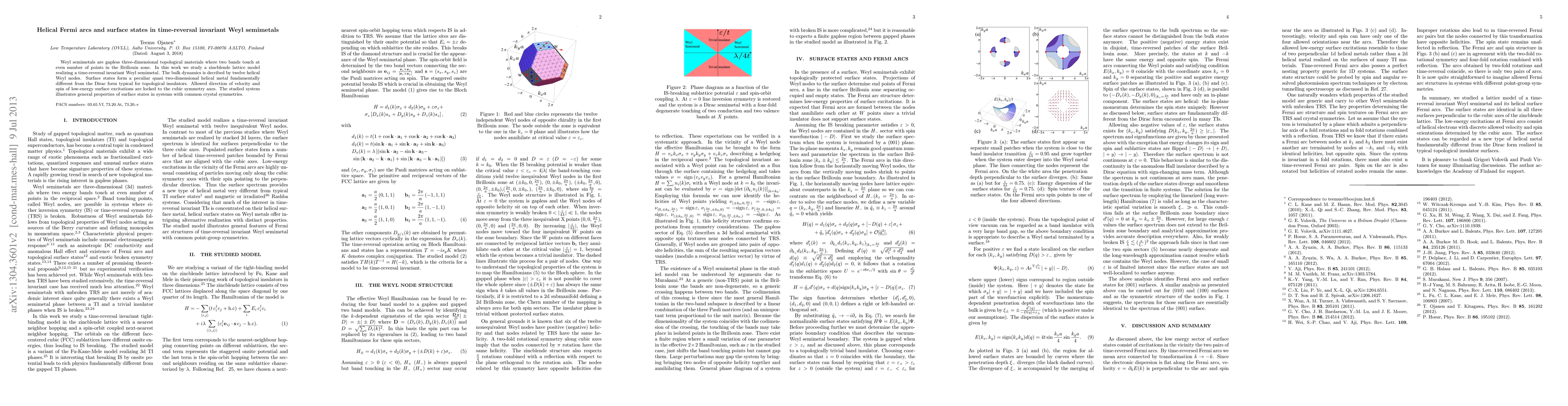 This research investigates a zincblende lattice model of time-reversal invariant Weyl semimetals, revealing helical Fermi arcs and unique surface states forming a quasi two-dimensional helical metal with velocity and spin aligned to cubic symmetry axes. These findings highlight general properties of surface states in such topological materials.