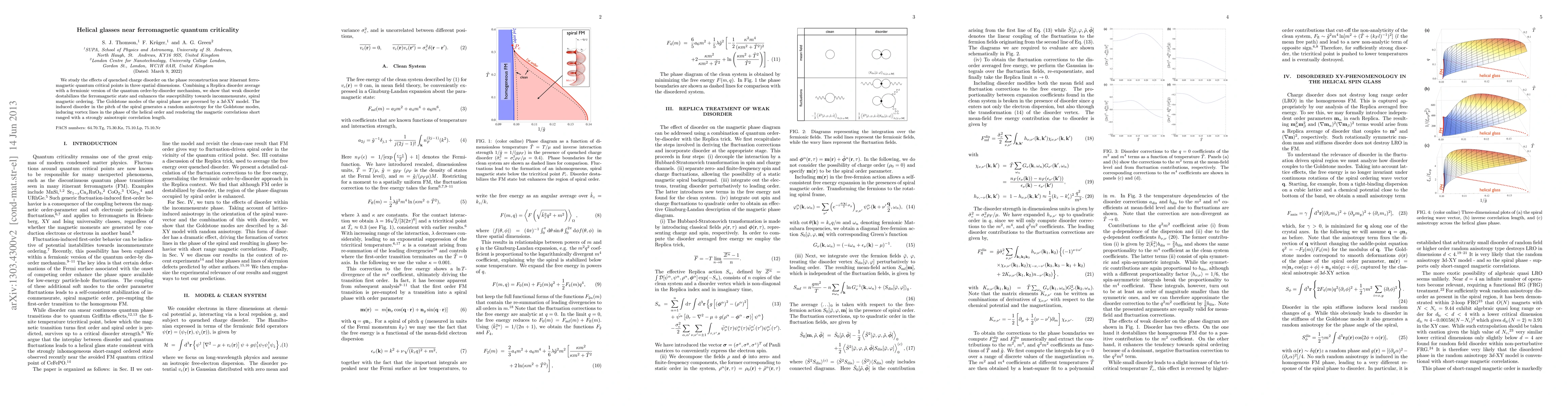 We study the effects of quenched charge disorder on the phase reconstruction near itinerant ferromagnetic quantum critical points in three spatial dimensions. Combining a replica disorder average with a fermionic version of the quantum order-by-disorder mechanism, we show that weak disorder destabilizes the ferromagnetic state and enhances the susceptibility towards incommensurate, spiral magnetic ordering. The Goldstone modes of the spiral phase are governed by a 3d-XY model. The induced disorder in the pitch of the spiral generates a random anisotropy for the Goldstone modes, inducing vortex lines in the phase of the helical order and rendering the magnetic correlations short ranged with a strongly anisotropic correlation length.