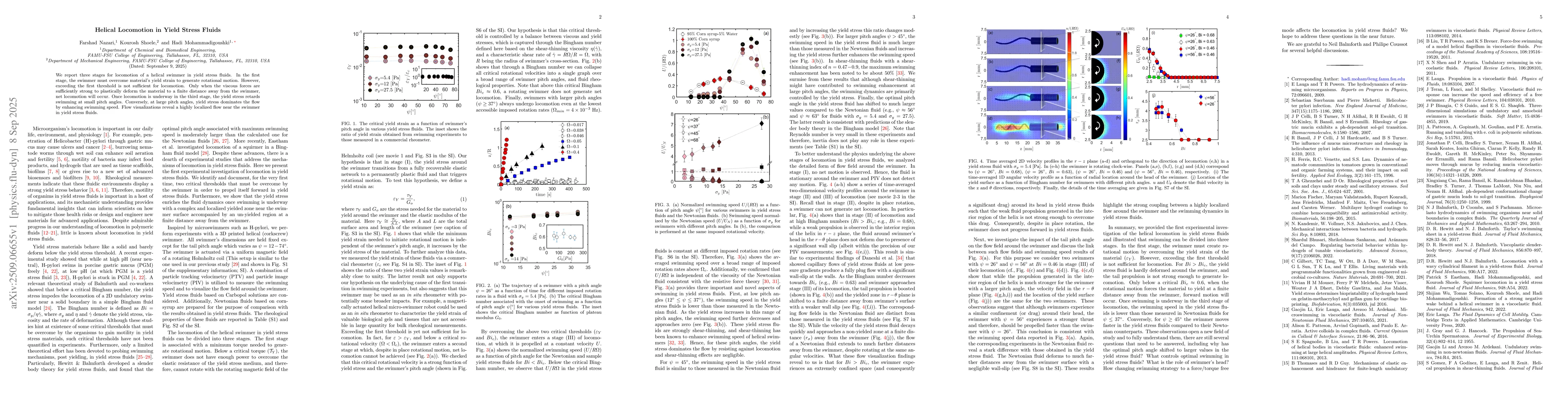 We report three stages for locomotion of a helical swimmer in yield stress fluids. In the first stage, the swimmer must overcome material's yield strain to generate rotational motion. However, exceeding the first threshold is not sufficient for locomotion. Only when the viscous forces are sufficiently strong to plastically deform the material to a finite distance away from the swimmer, net locomotion will occur. Once locomotion is underway in the third stage, the yield stress retards swimming at small pitch angles. Conversely, at large pitch angles, yield stress dominates the flow by enhancing swimming speed. Flow visualizations reveal a highly localized flow near the swimmer in yield stress fluids.