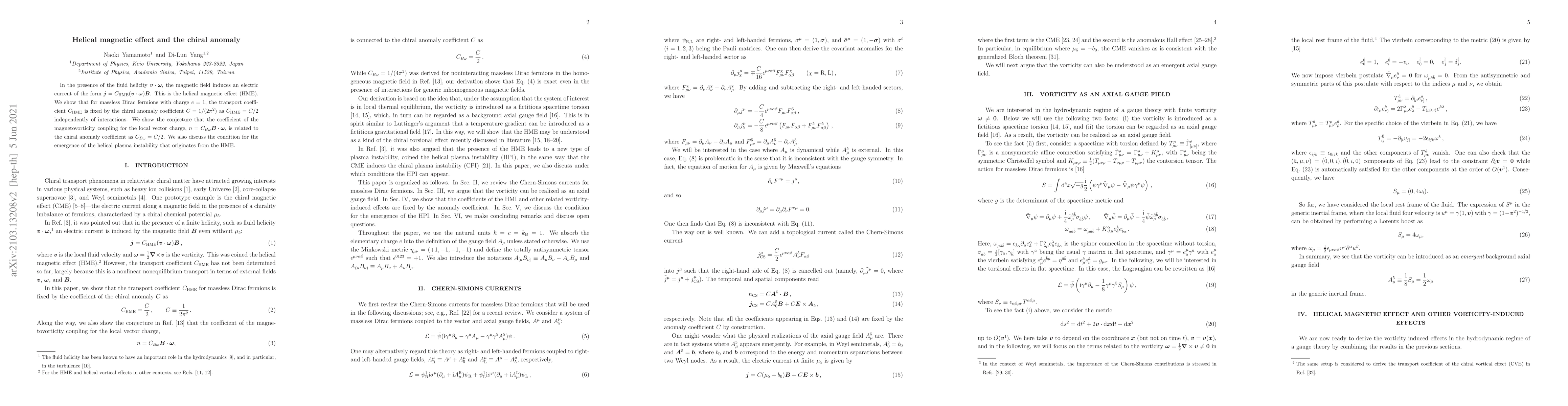 In the presence of the fluid helicity $\boldsymbol{v} \cdot \boldsymbol{\omega}$, the magnetic field induces an electric current of the form $\boldsymbol{j} = C_{\rm HME} (\boldsymbol{v} \cdot \boldsymbol{\omega}) \boldsymbol{B}$. This is the helical magnetic effect (HME). We show that for massless Dirac fermions with charge $e=1$, the transport coefficient $C_{\rm HME}$ is fixed by the chiral anomaly coefficient $C=1/(2\pi^2)$ as $C_{\rm HME} = C/2$ independently of interactions. We show the conjecture that the coefficient of the magnetovorticity coupling for the local vector charge, $n = C_{B \omega} \boldsymbol{B} \cdot \boldsymbol{\omega}$, is related to the chiral anomaly coefficient as $C_{B \omega} = C/2$. We also discuss the condition for the emergence of the helical plasma instability that originates from the HME.