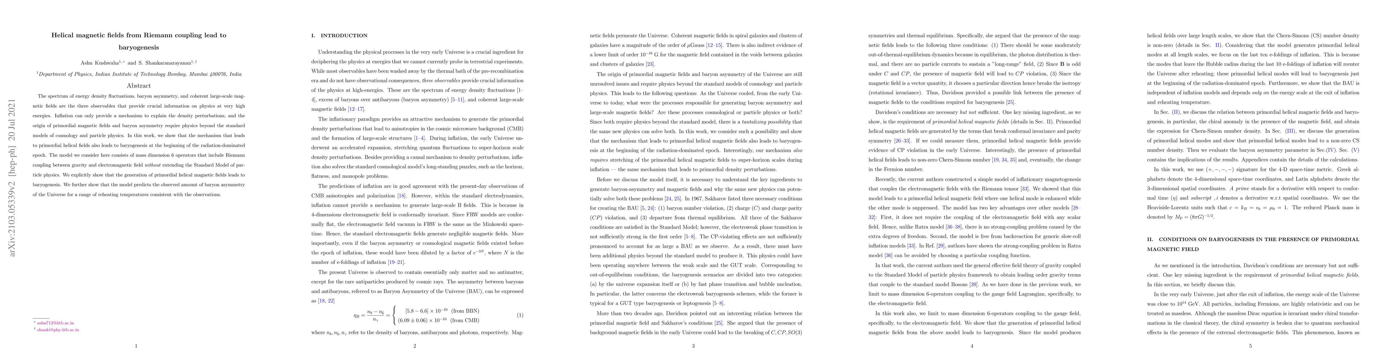 The spectrum of energy density fluctuations, baryon asymmetry, and coherent large-scale magnetic fields are the three observables that provide crucial information on physics at very high energies. Inflation can only provide a mechanism to explain the density perturbations, and the origin of primordial magnetic fields and baryon asymmetry require physics beyond the standard models of cosmology and particle physics. In this work, we show that the mechanism that leads to primordial helical fields also leads to baryogenesis at the beginning of the radiation-dominated epoch. The model we consider here consists of mass dimension 6 operators that include Riemann coupling between gravity and electromagnetic field without extending the Standard Model of particle physics. We explicitly show that the generation of primordial helical magnetic fields leads to baryogenesis. We further show that the model predicts the observed amount of baryon asymmetry of the Universe for a range of reheating temperatures consistent with the observations.