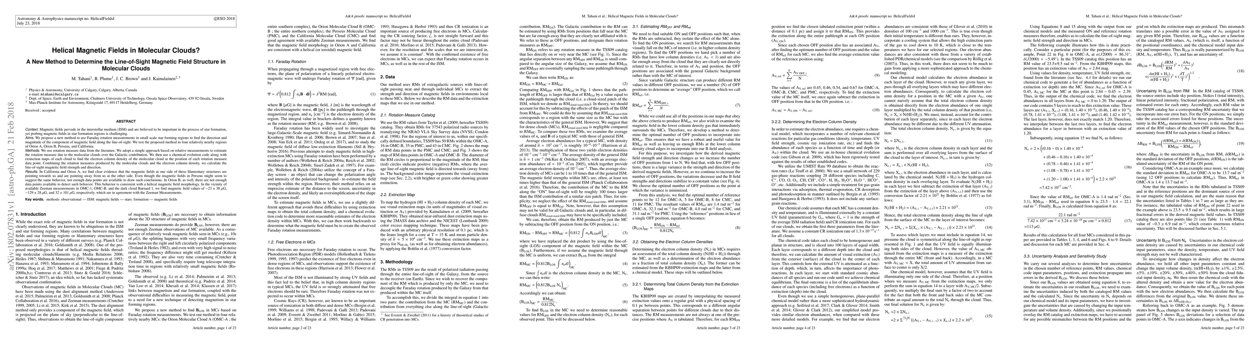 This paper proposes a novel method using Faraday rotation measurements to determine the line-of-sight magnetic field structure in molecular clouds, finding evidence of helical magnetic fields in Orion A and California. The method combines rotation measure data and electron column density to estimate magnetic field direction and magnitude.