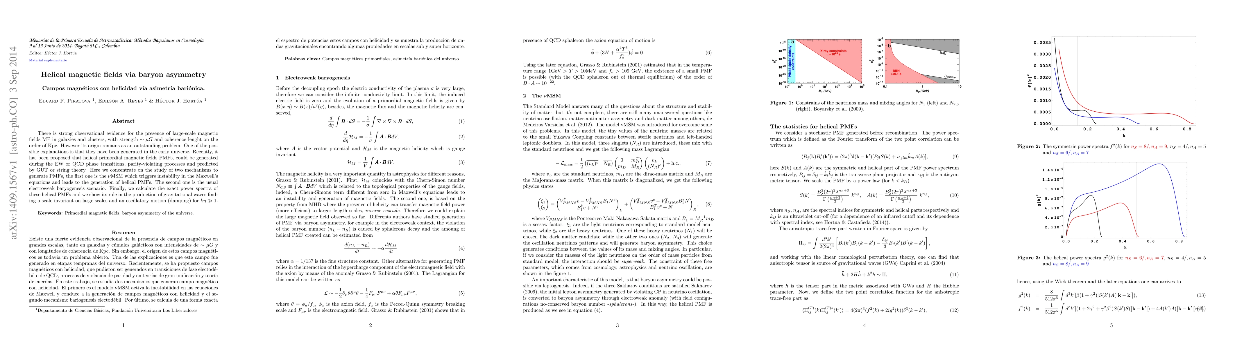 There is strong observational evidence for the presence of large-scale magnetic fields MF in galaxies and clusters, with strength $\sim \mu$G and coherence lenght on the order of Kpc. However its origin remains as an outstanding problem. One of the possible explanations is that they have been generated in the early universe. Recently, it has been proposed that helical primordial magnetic fields PMFs, could be generated during the EW or QCD phase transitions, parity-violating processes and predicted by GUT or string theory. Here we concentrate on the study of two mechanisms to generate PMFs, the first one is the $\nu$MSM which triggers instability in the Maxwell's equations and leads to the generation of helical PMFs. The second one is the usual electroweak baryogenesis scenario. Finally, we calculate the exact power spectra of these helical PMFs and we show its role in the production of gravitational waves finding a scale-invariant on large scales and an oscillatory motion (damping) for $k\eta \gg 1$