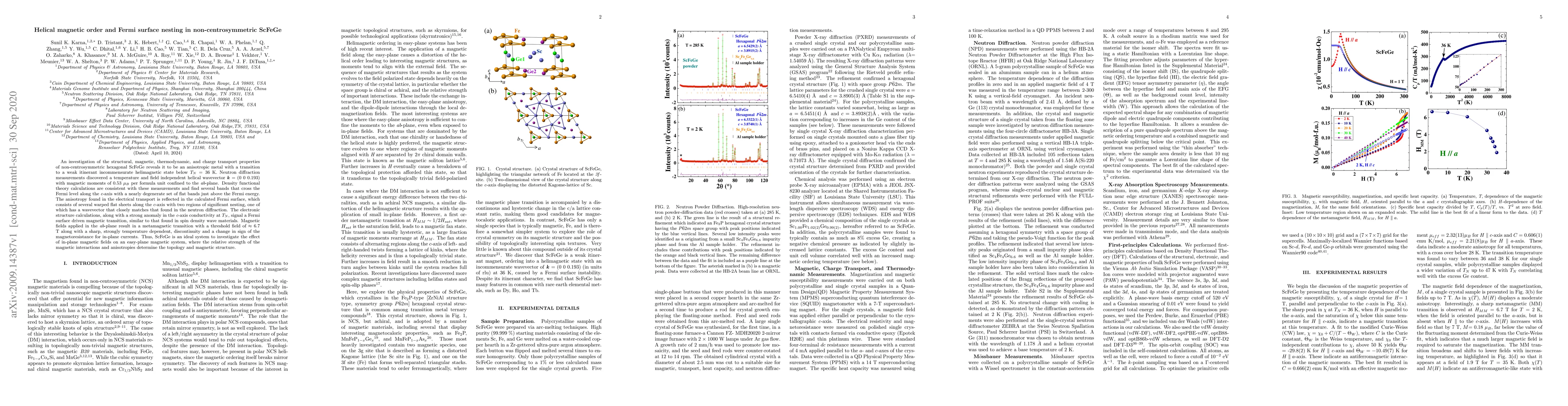 An investigation of the structural, magnetic, thermodynamic, and charge transport properties of non-centrosymmetric hexagonal ScFeGe reveals it to be an anisotropic metal with a transition to a weak itinerant incommensurate helimagnetic state below $T_N = 36$ K. Neutron diffraction measurements discovered a temperature and field independent helical wavevector \textbf{\textit{k}} = (0 0 0.193) with magnetic moments of 0.53 $\mu_{B}$ per formula unit confined to the {\it ab}-plane. Density functional theory calculations are consistent with these measurements and find several bands that cross the Fermi level along the {\it c}-axis with a nearly degenerate set of flat bands just above the Fermi energy. The anisotropy found in the electrical transport is reflected in the calculated Fermi surface, which consists of several warped flat sheets along the $c$-axis with two regions of significant nesting, one of which has a wavevector that closely matches that found in the neutron diffraction. The electronic structure calculations, along with a strong anomaly in the {\it c}-axis conductivity at $T_N$, signal a Fermi surface driven magnetic transition, similar to that found in spin density wave materials. Magnetic fields applied in the {\it ab}-plane result in a metamagnetic transition with a threshold field of $\approx$ 6.7 T along with a sharp, strongly temperature dependent, discontinuity and a change in sign of the magnetoresistance for in-plane currents. Thus, ScFeGe is an ideal system to investigate the effect of in-plane magnetic fields on an easy-plane magnetic system, where the relative strength of the magnetic interactions and anisotropies determine the topology and magnetic structure.