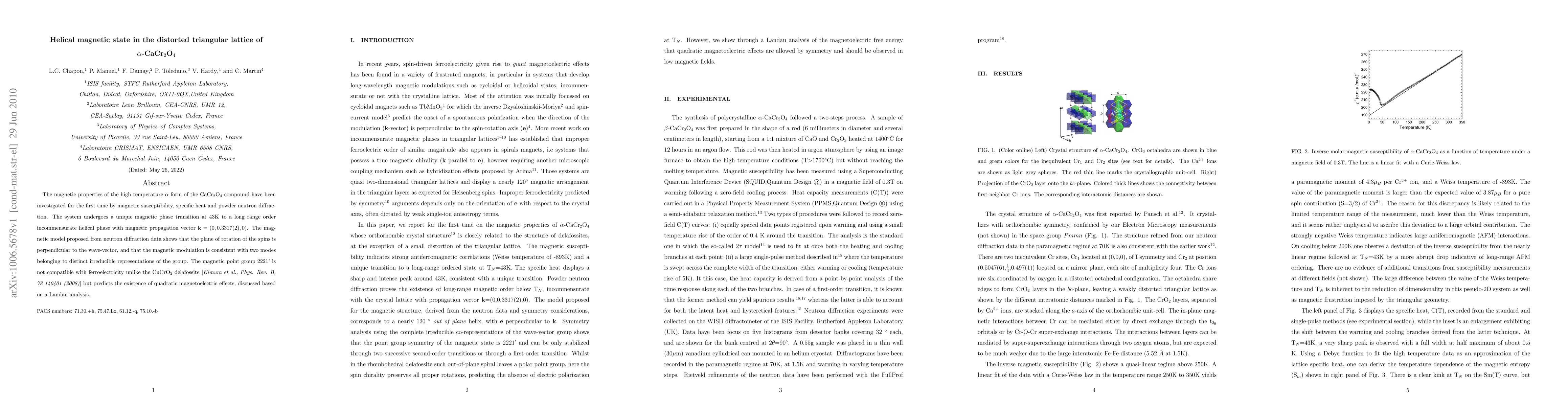The magnetic properties of the high temperature alpha form of the CaCr2O4 compound have been investigated for the first time by magnetic susceptibility, specific heat and powder neutron diffraction. The system undergoes a unique magnetic phase transition at 43K to a long range order incommensurate helical phase with magnetic propagation vector k=(0,0.3317(2),0). The magnetic model proposed from neutron diffraction data shows that the plane of rotation of the spins is perpendicular to the wave-vector, and that the magnetic modulation is consistent with two modes belonging to distinct irreducible representations of the group. The magnetic point group 2221' is not compatible with ferroelectricity unlike the CuCrO2 delafossite [Kimura et al., Phys. Rev. B, 78 140401 (2008)] but predicts the existence of quadratic magnetoelectric effects, discussed based on a Landau analysis.