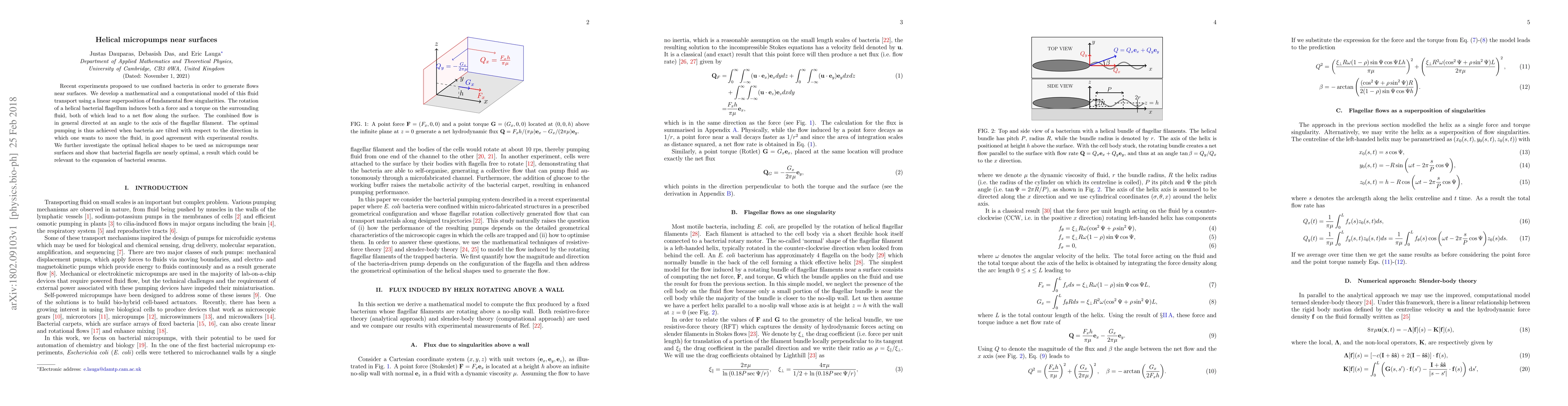 Recent experiments proposed to use confined bacteria in order to generate flows near surfaces. We develop a mathematical and a computational model of this fluid transport using a linear superposition of fundamental flow singularities. The rotation of a helical bacterial flagellum induces both a force and a torque on the surrounding fluid, both of which lead to a net flow along the surface. The combined flow is in general directed at an angle to the axis of the flagellar filament. The optimal pumping is thus achieved when bacteria are tilted with respect to the direction in which one wants to move the fluid, in good agreement with experimental results. We further investigate the optimal helical shapes to be used as micropumps near surfaces and show that bacterial flagella are nearly optimal, a result which could be relevant to the expansion of bacterial swarms.