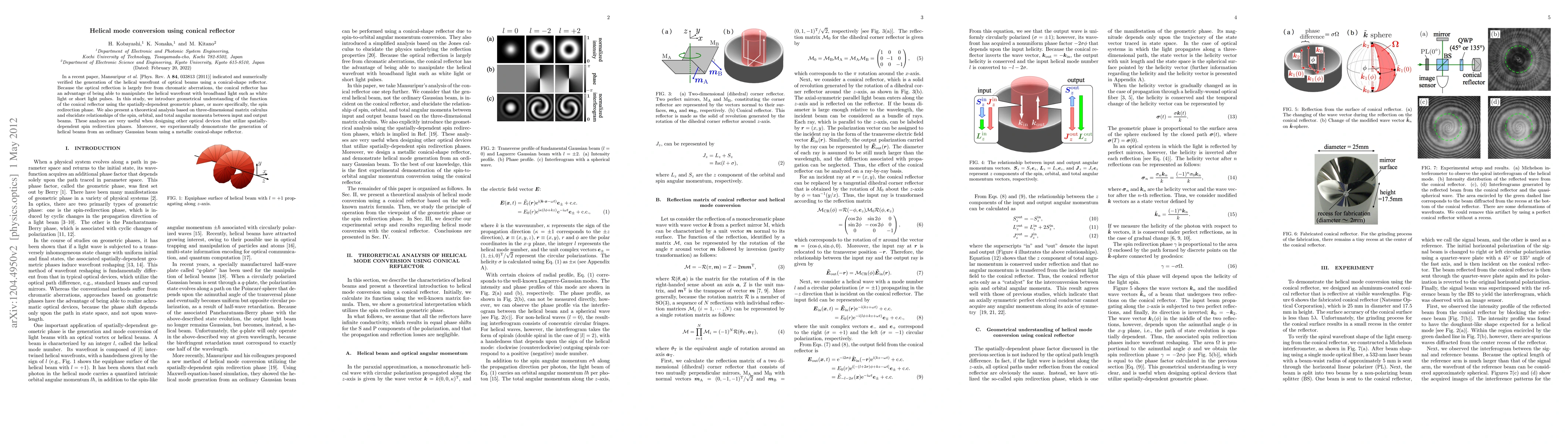 This paper explores the helical mode conversion of optical beams using a conical reflector, explaining its function through the spatially-dependent geometric phase and spin redirection phase. It provides theoretical analysis and experimental validation for generating helical beams from Gaussian beams using metallic conical reflectors.