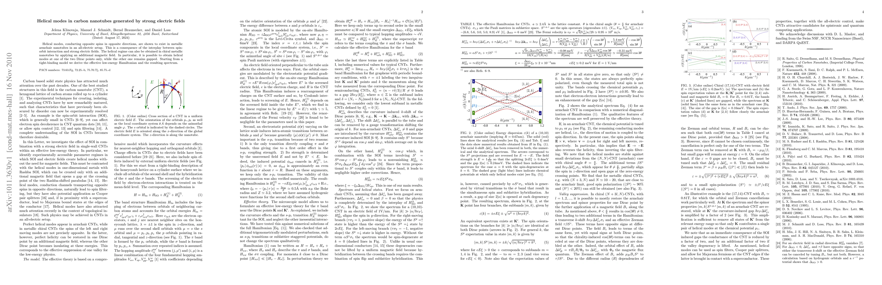 This paper explores the emergence of helical modes in metallic armchair carbon nanotubes under strong electric fields, driven by the interaction between spin-orbit coupling and the electric field. It also demonstrates that similar helical modes can be induced in chiral metallic nanotubes with an additional magnetic field, selectively affecting one of the Dirac points.