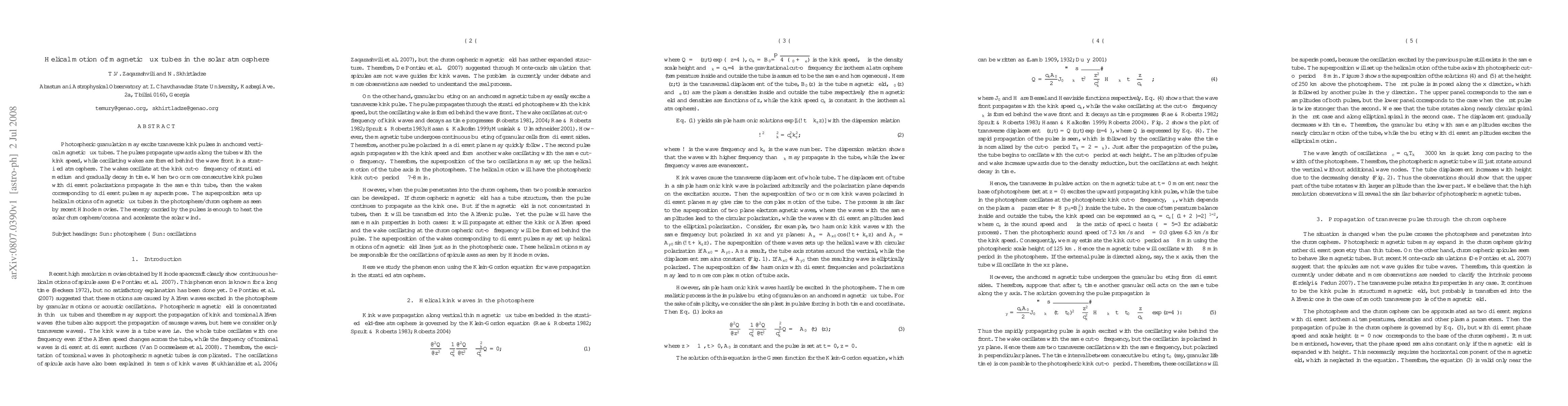 This paper explores how photospheric granulation can induce transverse kink pulses in vertical magnetic flux tubes, leading to helical motions in the solar atmosphere. The study finds that these motions, driven by superimposed oscillations, contribute to heating the solar chromosphere/corona and accelerating the solar wind.