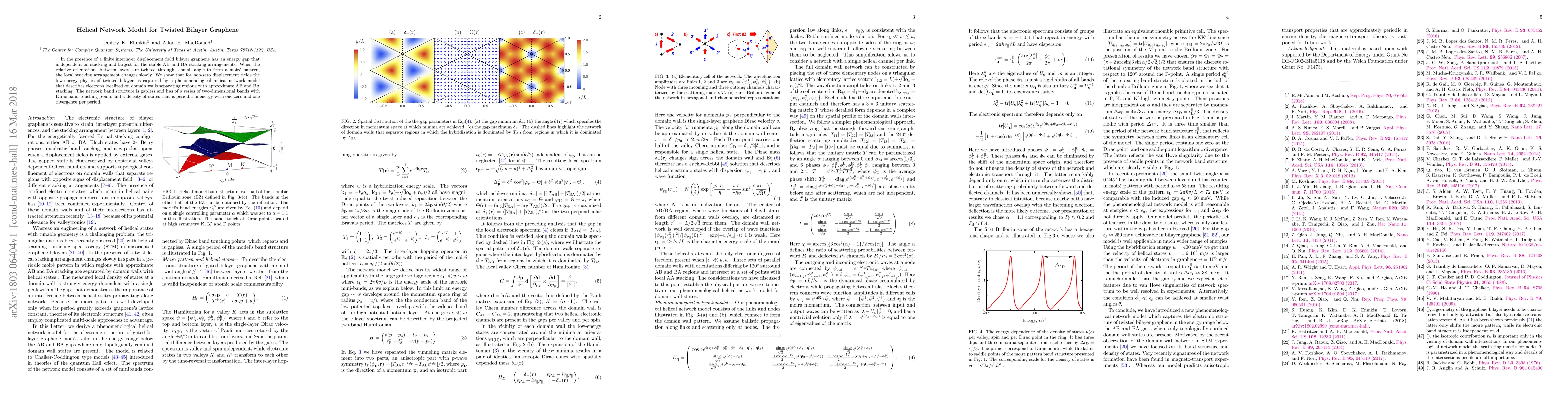 In the presence of a finite interlayer displacement field bilayer graphene has an energy gap that is dependent on stacking and largest for the stable AB and BA stacking arrangements. When the relative orientations between layers are twisted through a small angle to form a moir$\mathrm{\acute{e}}$ pattern, the local stacking arrangement changes slowly. We show that for non-zero displacement fields the low-energy physics of twisted bilayers is captured by a phenomenological helical network model that describes electrons localized on domain walls separating regions with approximate AB and BA stacking. The network band structure is gapless and has of a series of two-dimensional bands with Dirac band-touching points and a density-of-states that is periodic in energy with one zero and one divergence per period.