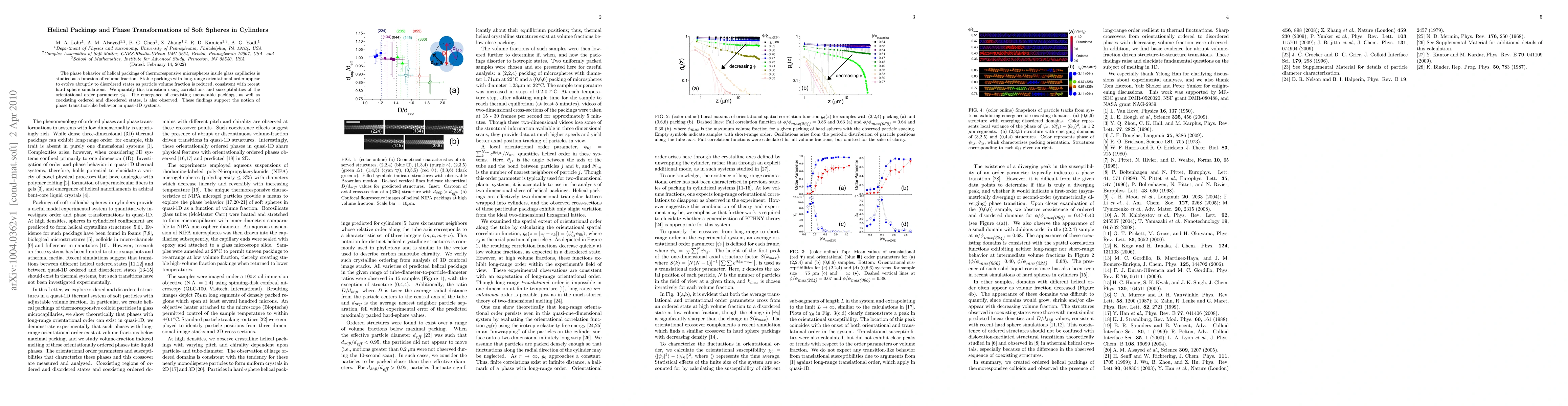 The phase behavior of helical packings of thermoresponsive microspheres inside glass capillaries is studied as a function of volume fraction. Stable packings with long-range orientational order appear to evolve abruptly to disordered states as particle volume fraction is reduced, consistent with recent hard sphere simulations. We quantify this transition using correlations and susceptibilities of the orientational order parameter psi_6. The emergence of coexisting metastable packings, as well as coexisting ordered and disordered states, is also observed. These findings support the notion of phase transition-like behavior in quasi-1D systems.