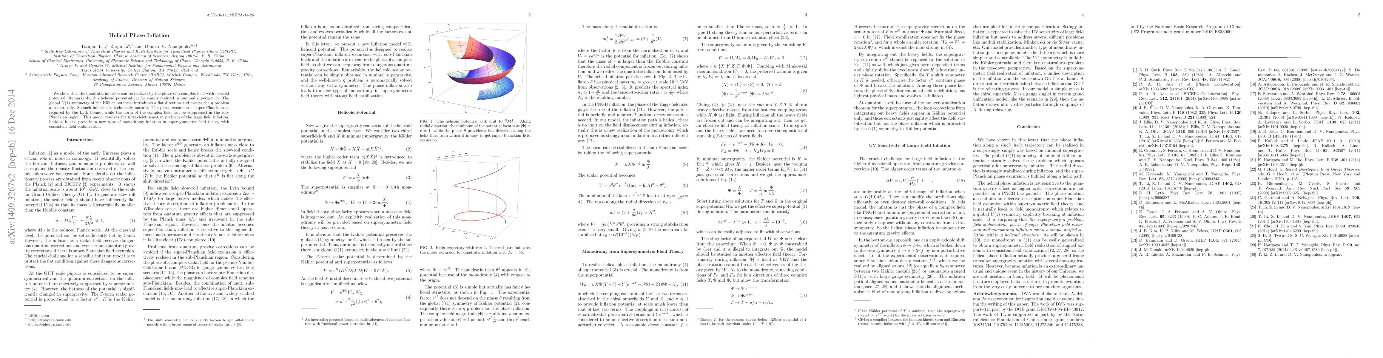 This paper proposes a helical phase inflation model using a complex field with a helicoid potential in minimal supergravity, which naturally evades the $\eta$ problem and resolves ultraviolet sensitivity issues. The model achieves a super-Planckian phase excursion and offers a new type of monodromy inflation with stable field configurations.