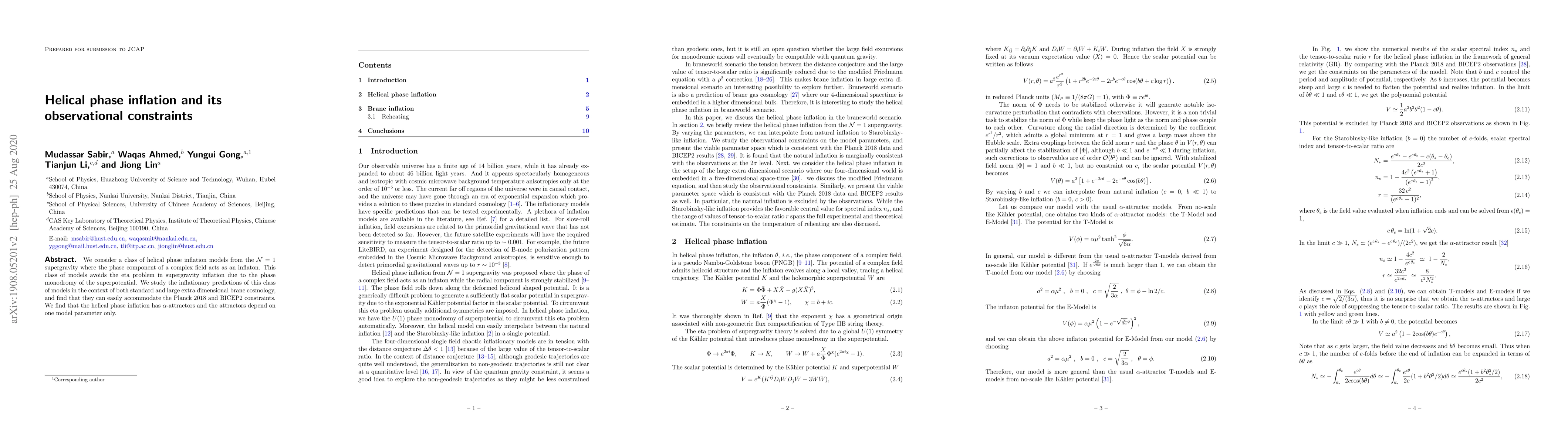 Helical phase inflation models from ${\mathcal N}=1$ supergravity use the phase of a complex field as an inflaton, avoiding the eta problem. These models meet Planck 2018 and BICEP2 observational constraints and exhibit $\alpha$-attractors dependent on a single model parameter.