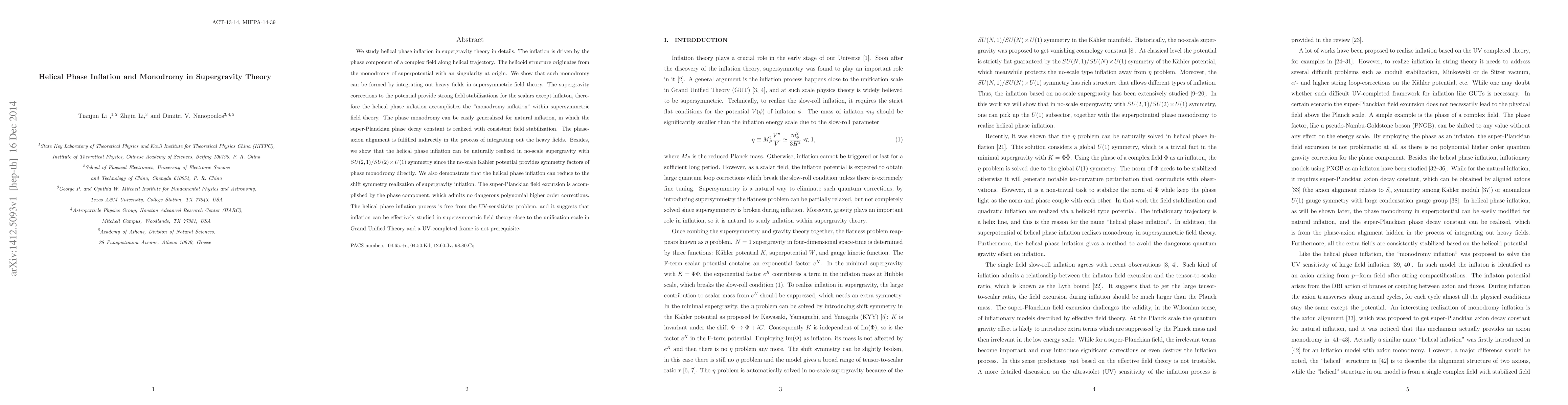 We study helical phase inflation in supergravity theory in details. The inflation is driven by the phase component of a complex field along helical trajectory. The helicoid structure originates from the monodromy of superpotential with an singularity at origin. We show that such monodromy can be formed by integrating out heavy fields in supersymmetric field theory. The supergravity corrections to the potential provide strong field stabilizations for the scalars except inflaton, therefore the helical phase inflation accomplishes the "monodromy inflation" within supersymmetric field theory. The phase monodromy can be easily generalized for natural inflation, in which the super-Planckian phase decay constant is realized with consistent field stabilization. The phase-axion alignment is fulfilled indirectly in the process of integrating out the heavy fields. Besides, we show that the helical phase inflation can be naturally realized in no-scale supergravity with $SU(2,1)/SU(2)\times U(1)$ symmetry since the no-scale K\"ahler potential provides symmetry factors of phase monodromy directly. We also demonstrate that the helical phase inflation can reduce to the shift symmetry realization of supergravity inflation. The super-Planckian field excursion is accomplished by the phase component, which admits no dangerous polynomial higher order corrections. The helical phase inflation process is free from the UV-sensitivity problem, and it suggests that inflation can be effectively studied in supersymmetric field theory close to the unification scale in Grand Unified Theory and a UV-completed frame is not prerequisite.