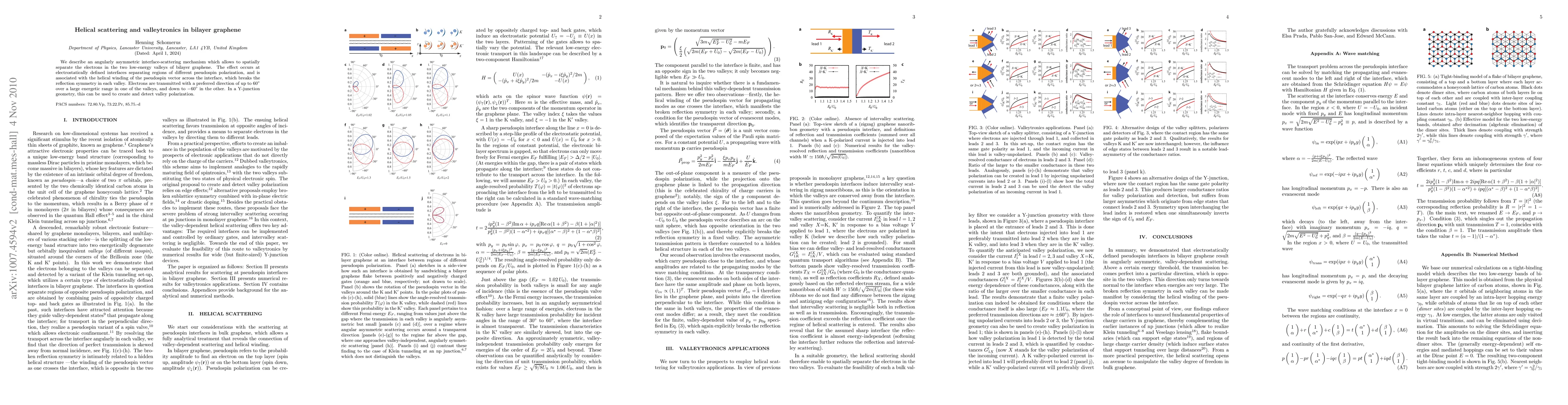 We describe an angularly asymmetric interface-scattering mechanism which allows to spatially separate the electrons in the two low-energy valleys of bilayer graphene. The effect occurs at electrostatically defined interfaces separating regions of different pseudospin polarization, and is associated with the helical winding of the pseudospin vector across the interface, which breaks the reflection symmetry in each valley. Electrons are transmitted with a preferred direction of up to 60 degree over a large energetic range in one of the valleys, and down to -60 degree in the other. In a Y-junction geometry, this can be used to create and detect valley polarization.