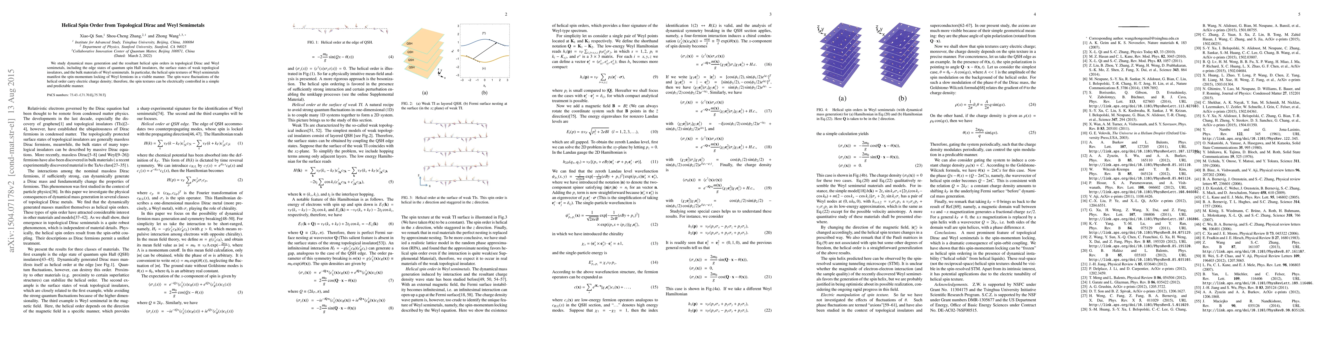 This research explores the helical spin orders arising from dynamical mass generation in topological Dirac and Weyl semimetals, highlighting visible spin-momentum locking in Weyl fermions. The study reveals that spin-wave fluctuations in these materials can carry electric charge density, allowing for electrically controlled spin textures.
