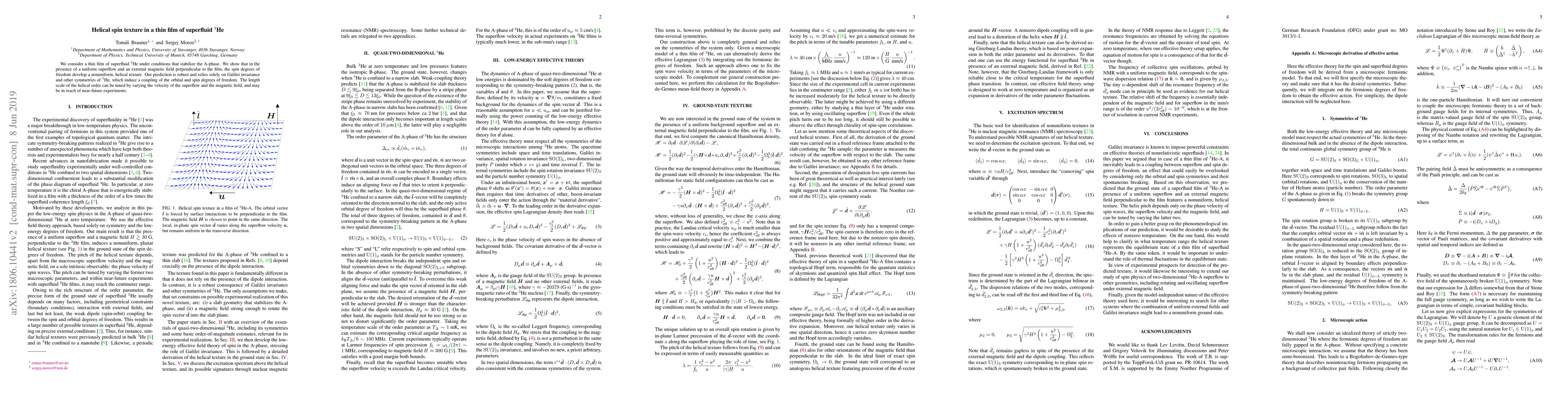 The study demonstrates that a thin film of superfluid ${}^3$He in the A-phase exhibits a helical spin texture when subjected to superflow and a perpendicular magnetic field. This helical spin order results from the coupling of orbital and spin degrees of freedom, influenced by symmetries and tunable by superflow velocity and magnetic field strength.