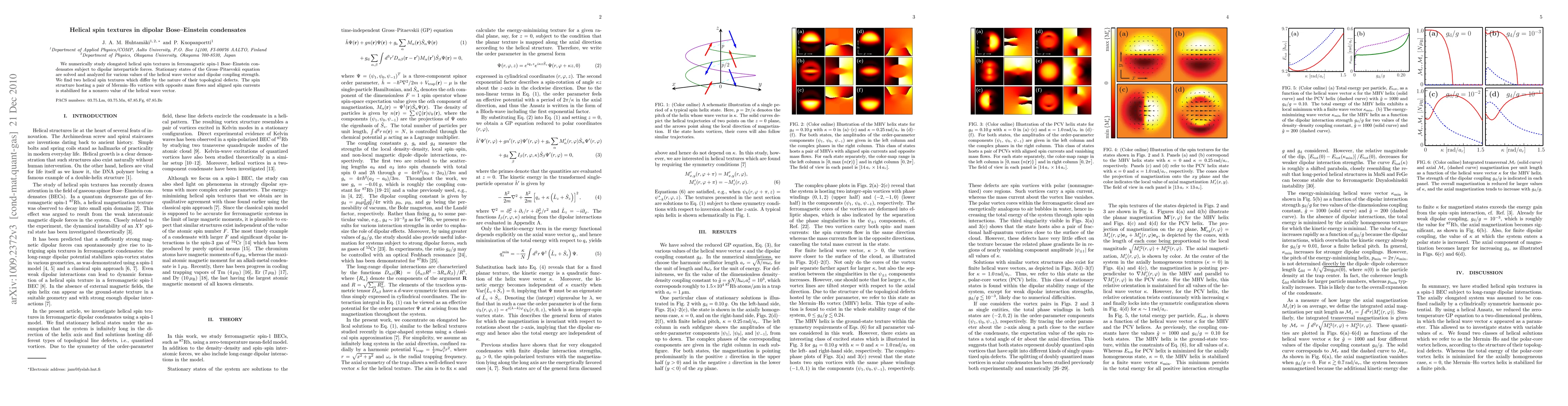 This paper numerically investigates helical spin textures in ferromagnetic spin-1 Bose-Einstein condensates influenced by dipolar interparticle forces, revealing two distinct helical spin textures with different topological defects. One texture features Mermin-Ho vortices with opposite mass flows and aligned spin currents, stabilized at a nonzero helical wave vector.