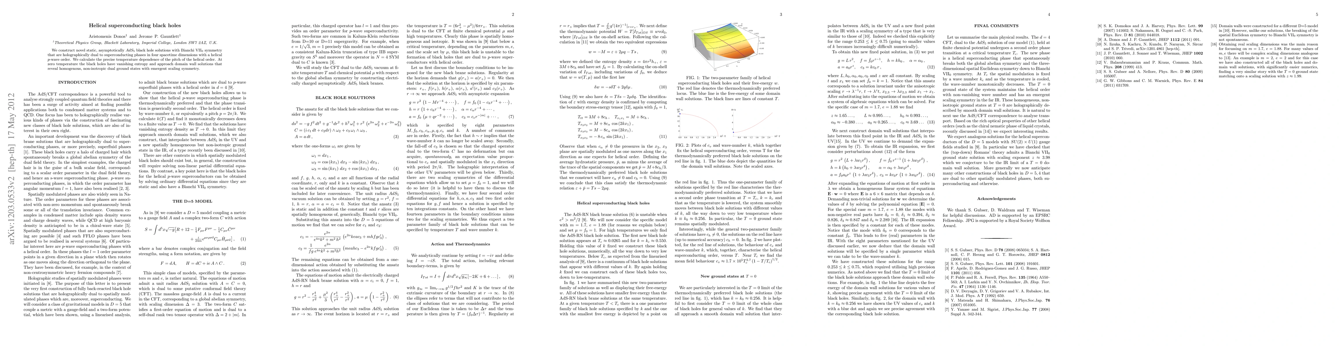 We construct novel static, asymptotically $AdS_5$ black hole solutions with Bianchi VII$_0$ symmetry that are holographically dual to superconducting phases in four spacetime dimensions with a helical p-wave order. We calculate the precise temperature dependence of the pitch of the helical order. At zero temperature the black holes have vanishing entropy and approach domain wall solutions that reveal homogenous, non-isotropic dual ground states with emergent scaling symmetry.