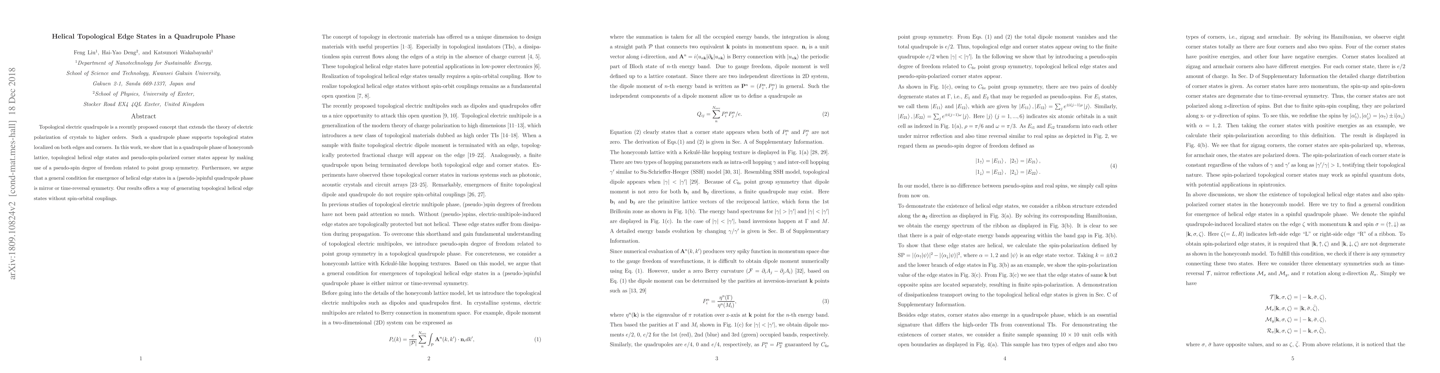 This paper explores topological electric quadrupoles in a honeycomb lattice, revealing helical edge states and pseudo-spin-polarized corner states. The study demonstrates that these states emerge without spin-orbital coupling, relying instead on mirror or time-reversal symmetry.