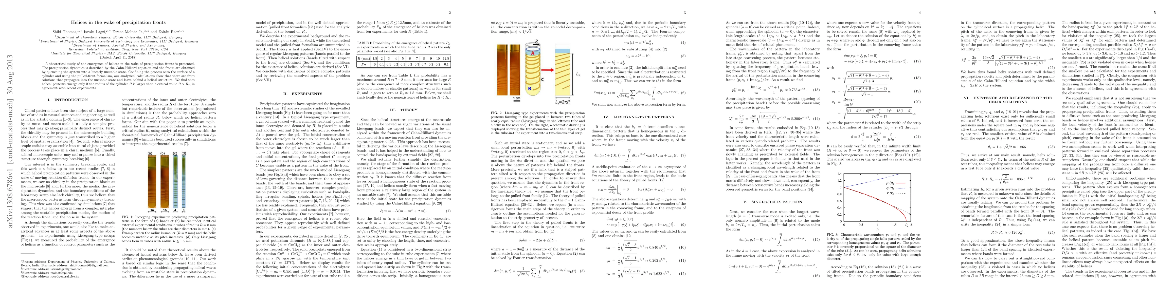 A theoretical study of the emergence of helices in the wake of precipitation fronts is presented. The precipitation dynamics is described by the Cahn-Hilliard equation and the fronts are obtained by quenching the system into a linearly unstable state. Confining the process onto the surface of a cylinder and using the pulled-front formalism, our analytical calculations show that there are front solutions that propagate into the unstable state and leave behind a helical structure. We find that helical patterns emerge only if the radius of the cylinder R is larger than a critical value R>R_c, in agreement with recent experiments.